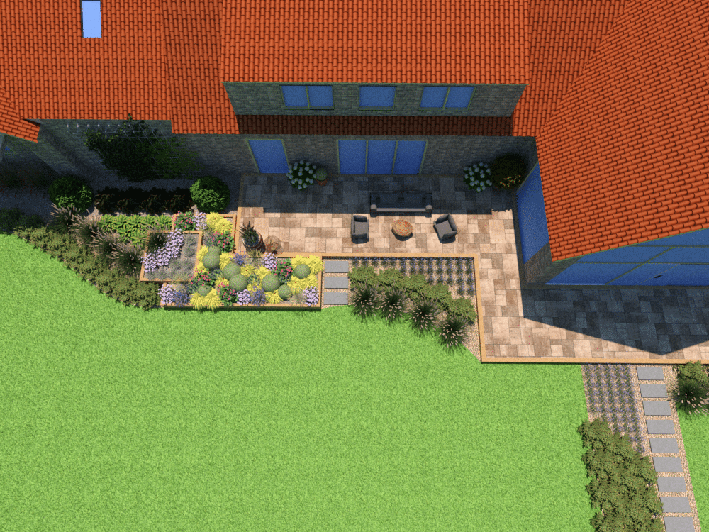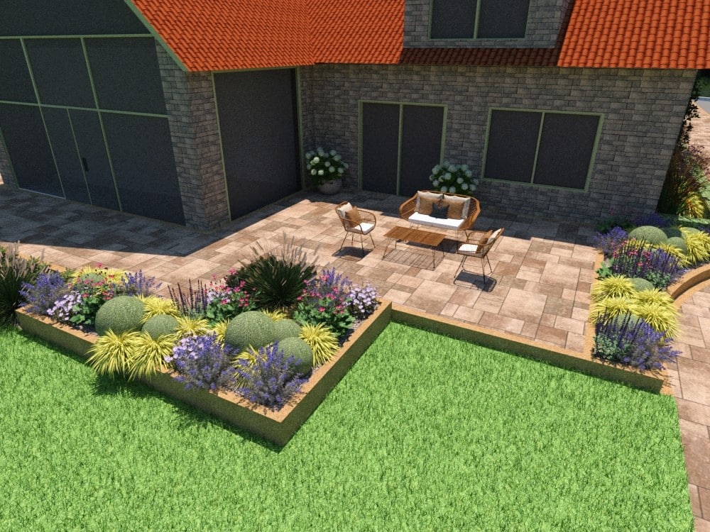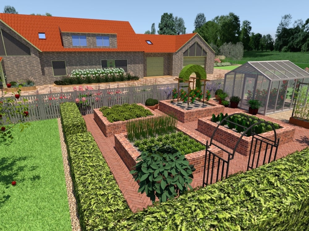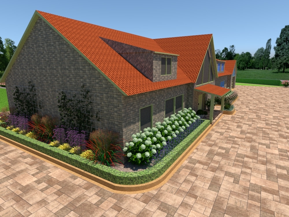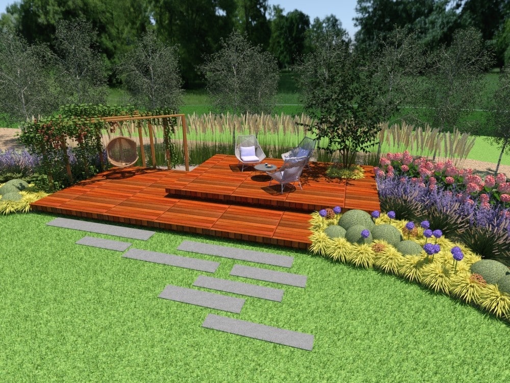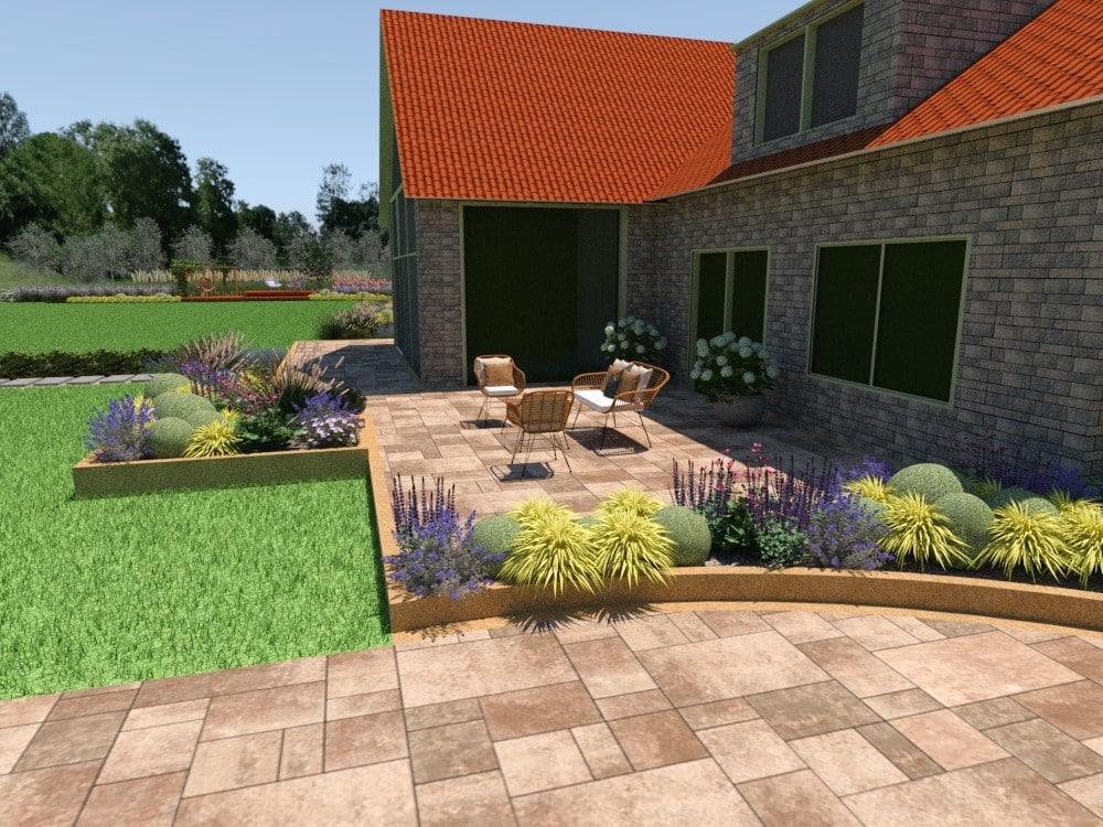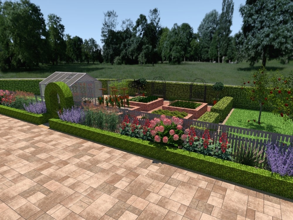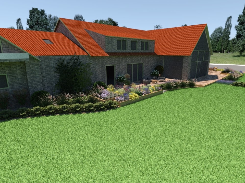 Projekt ogrodu nad Jeziorakiem to przestrzeń o rustykalnym, wiejskim charakterze z romantycznym akcentem, gdzie natura i harmonia odgrywają główną rolę. Centralnym punktem tego ogrodu są podwyższone rabaty przy tarasie, które oblewają przestrzeń delikatnymi nasadzeniami bylinowymi, takimi jak werbena, kocimiętka i szałwia. Towarzyszą im subtelne trawy, jak ostnice i turzyce, które wprowadzają lekkość i naturalny ruch, tworząc wrażenie miękkości i przytulności. Na terenie ogrodu zaplanowano spory ogród warzywny ze szklarnią, wydzielony drewnianym płotem w kolorze delikatnej szałwii, co nadaje całości spójny, naturalny wygląd. Ogród warzywny jest otoczony licznymi, barwnymi bylinami, które dodają koloru i sielskości tej części ogrodu, łącząc funkcjonalność z estetyką. Ścieżka prowadząca nad wodę obsadzona została kolumnowymi wiśniami oraz wzbogacony grupami róż, czerwonego berberysu i rozplenicy. Te powtarzające się nasadzenia wprowadzają rytm i spójność do całego ogrodu, tworząc malownicze przejście z domu wprost nad jezioro. Całość jest przestrzenią sprzyjającą wypoczynkowi, życiu blisko natury oraz cieszeniu się jej urokami, zachowując rustykalny, romantyczny klimat.