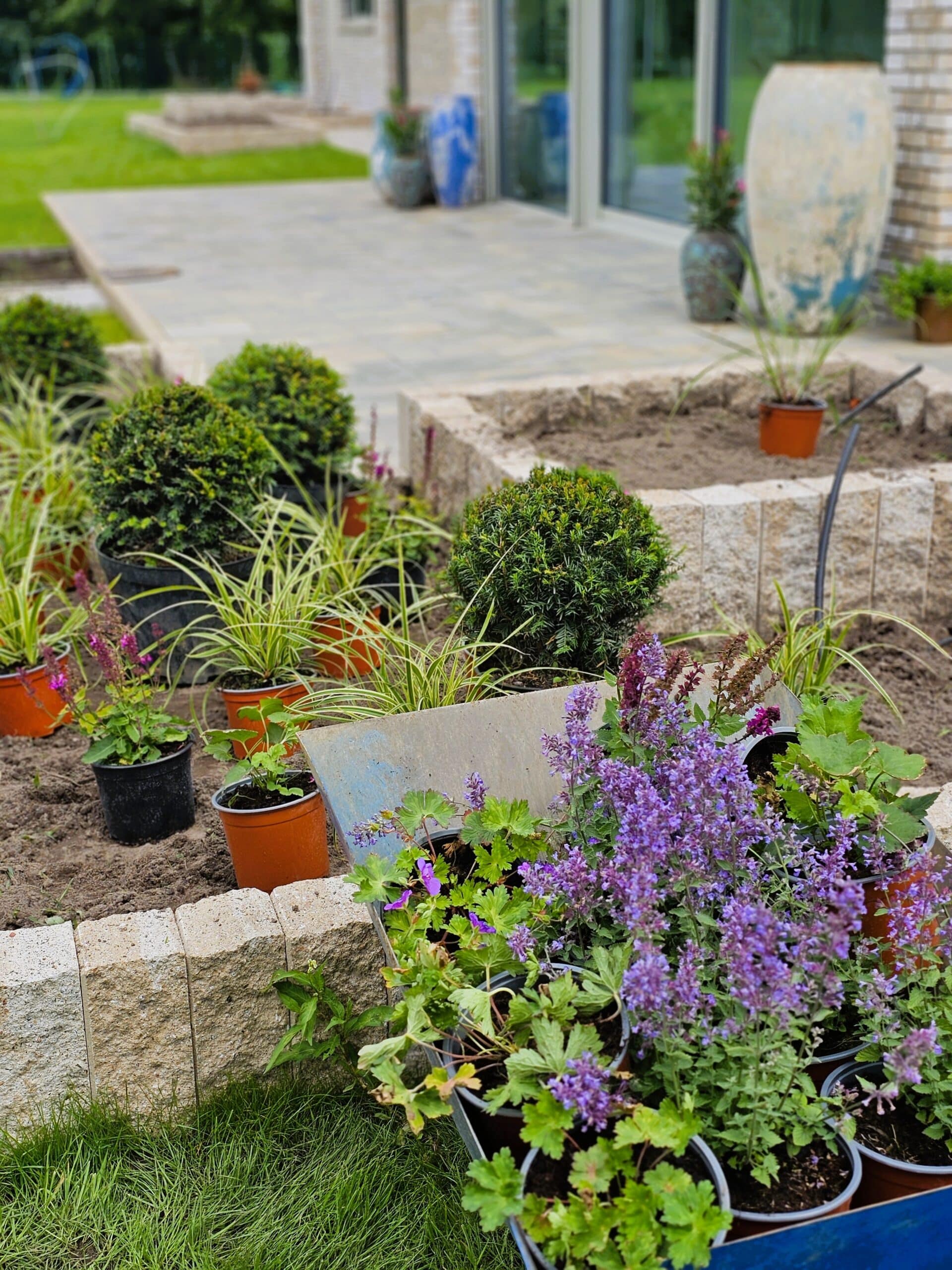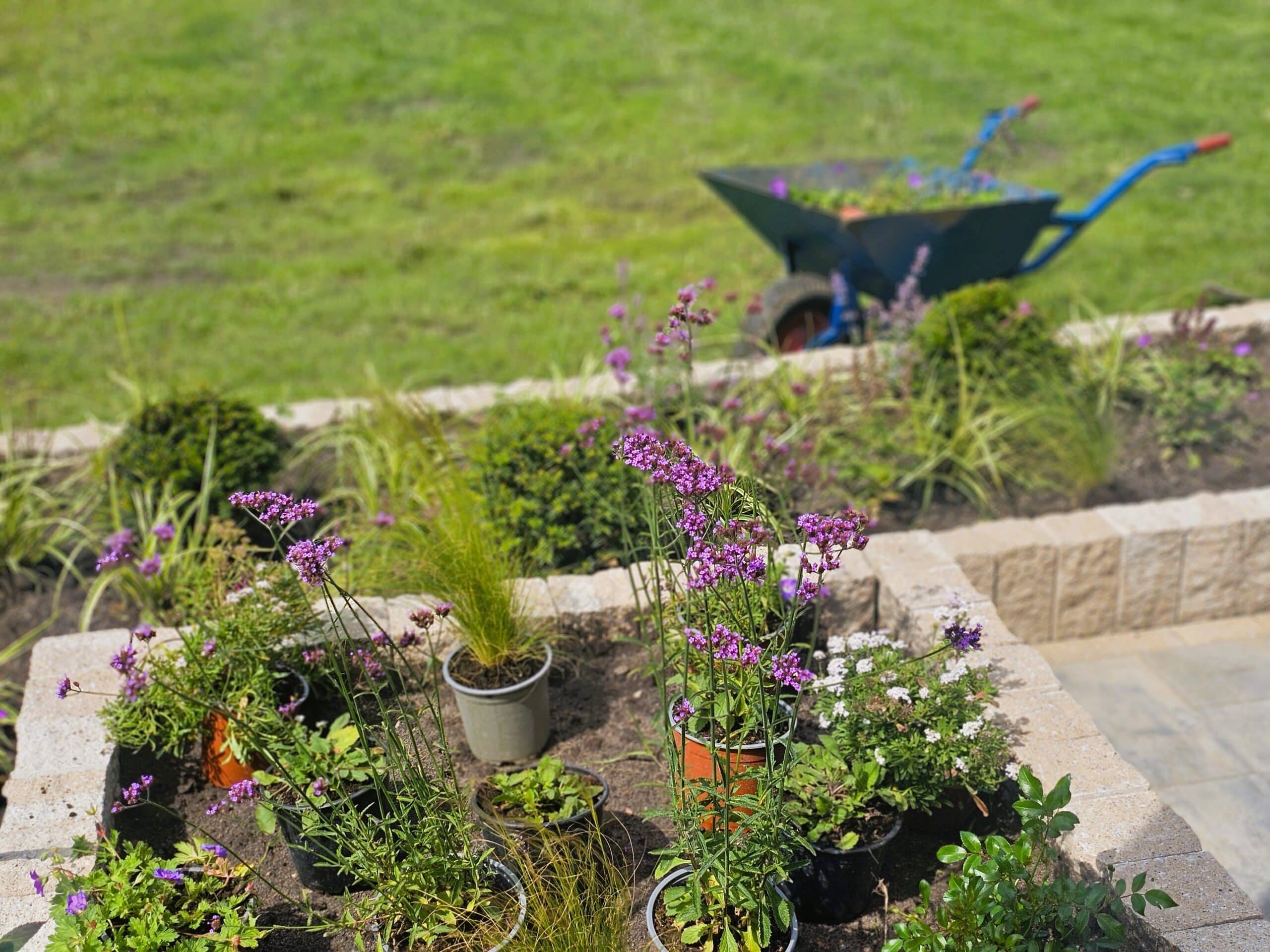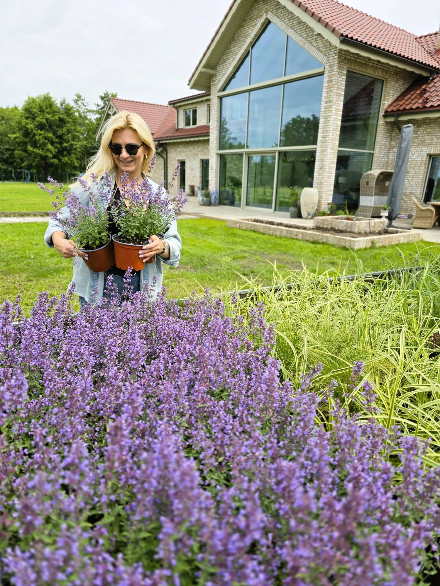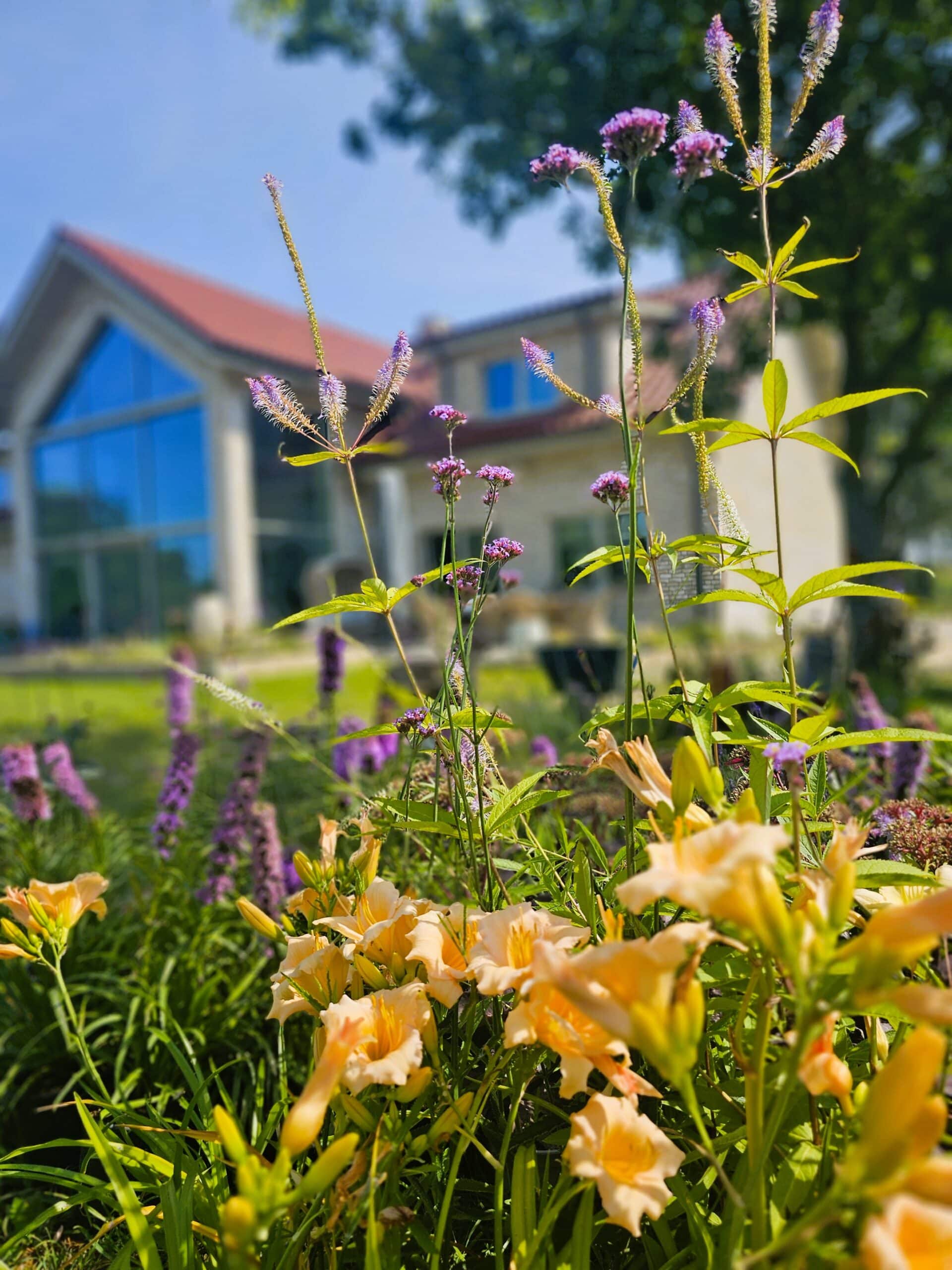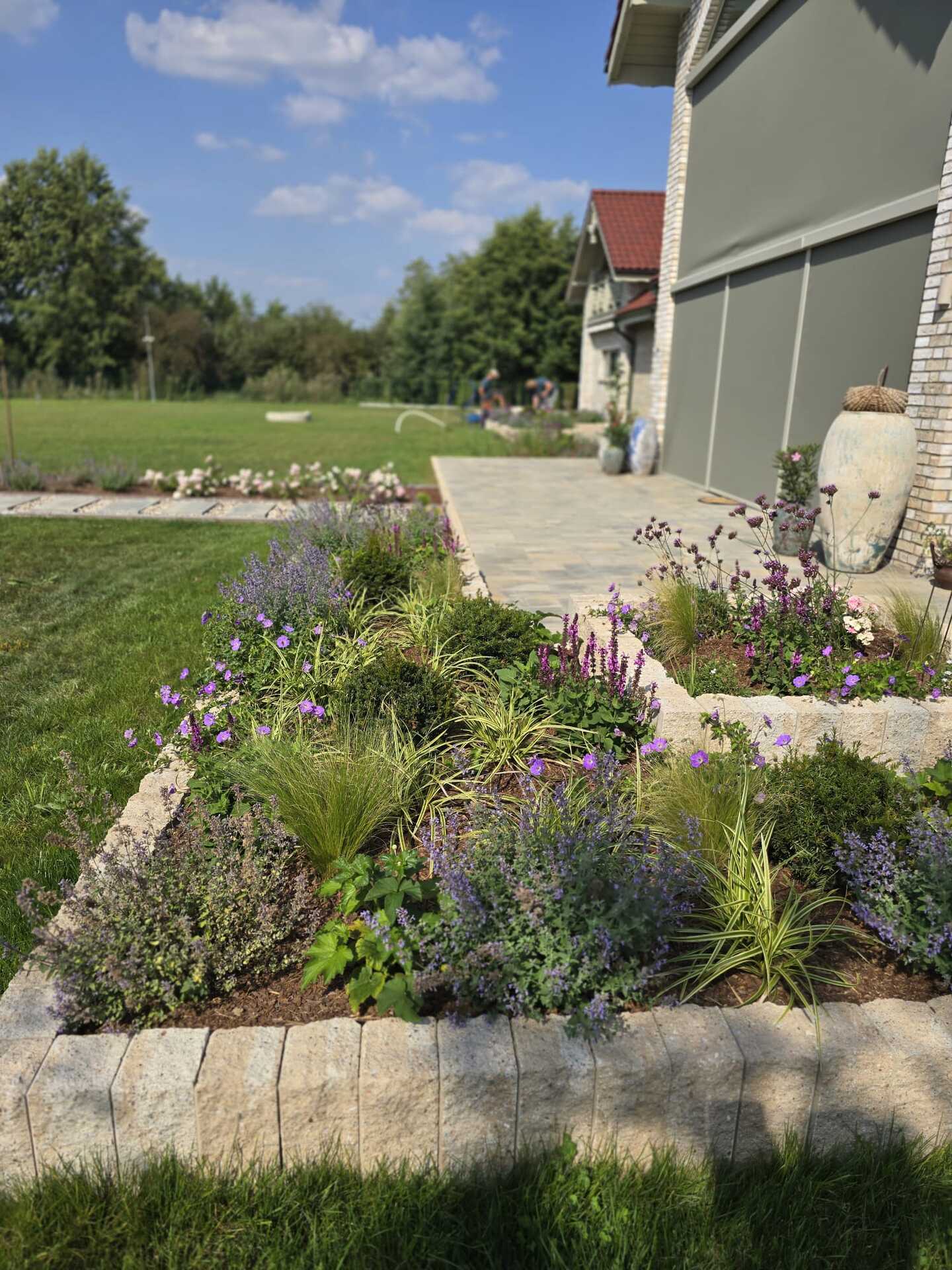 Ogród nad jeziorem Jeziorak zyskał wyjątkowy wygląd dzięki starannie zaprojektowanym rabatom bylinowym. Niektóre z nich zostały podniesione, co dodaje głębi przestrzeni. Całość urządzona jest w romantycznym, sielskim stylu, który idealnie komponuje się z malowniczym krajobrazem jeziora. W ogrodzie królują delikatne perowskie, trawy, które wprowadzają lekkość i ruch do przestrzeni. Ich subtelne kłosy kontrastują z intensywnym zapachem lawendy, która dodaje aromatycznego akcentu. Kuliste cisy, precyzyjnie formowane, nadają rabatom elegancki i uporządkowany wygląd, tworząc zielone, strukturalne elementy w ogrodzie atrakcyjne także zimą. Wśród nich wyróżniają się werbeny patagońskie, które swoim długim okresem kwitnienia i intensywnymi barwami wprowadzają kolorystyczną różnorodność.