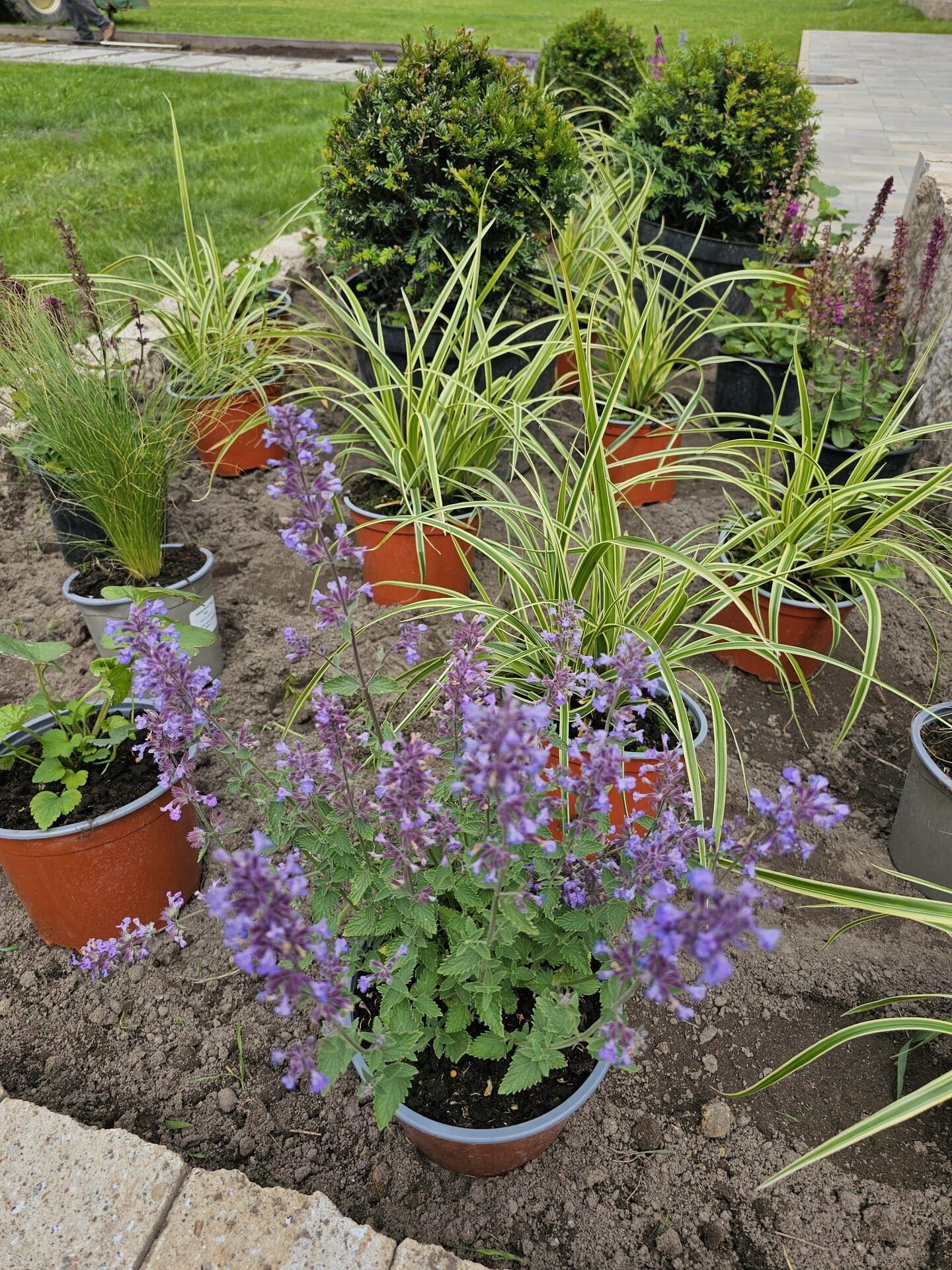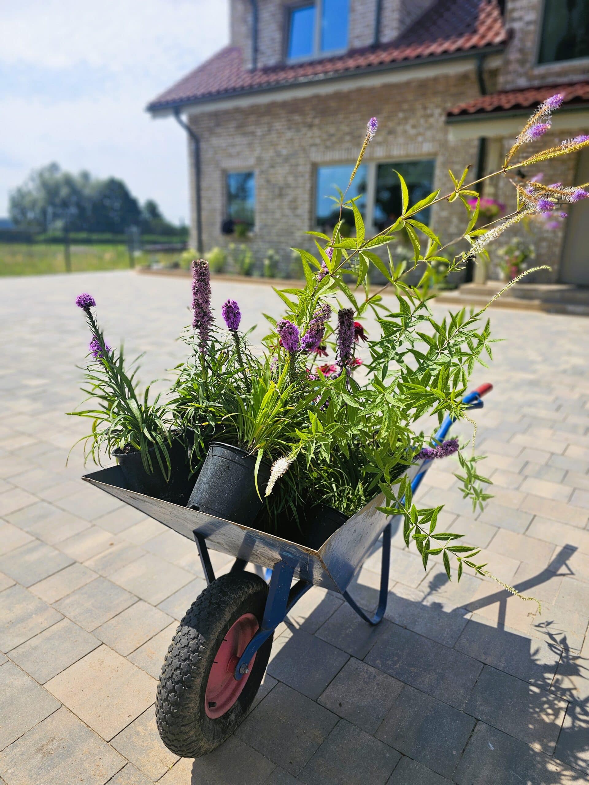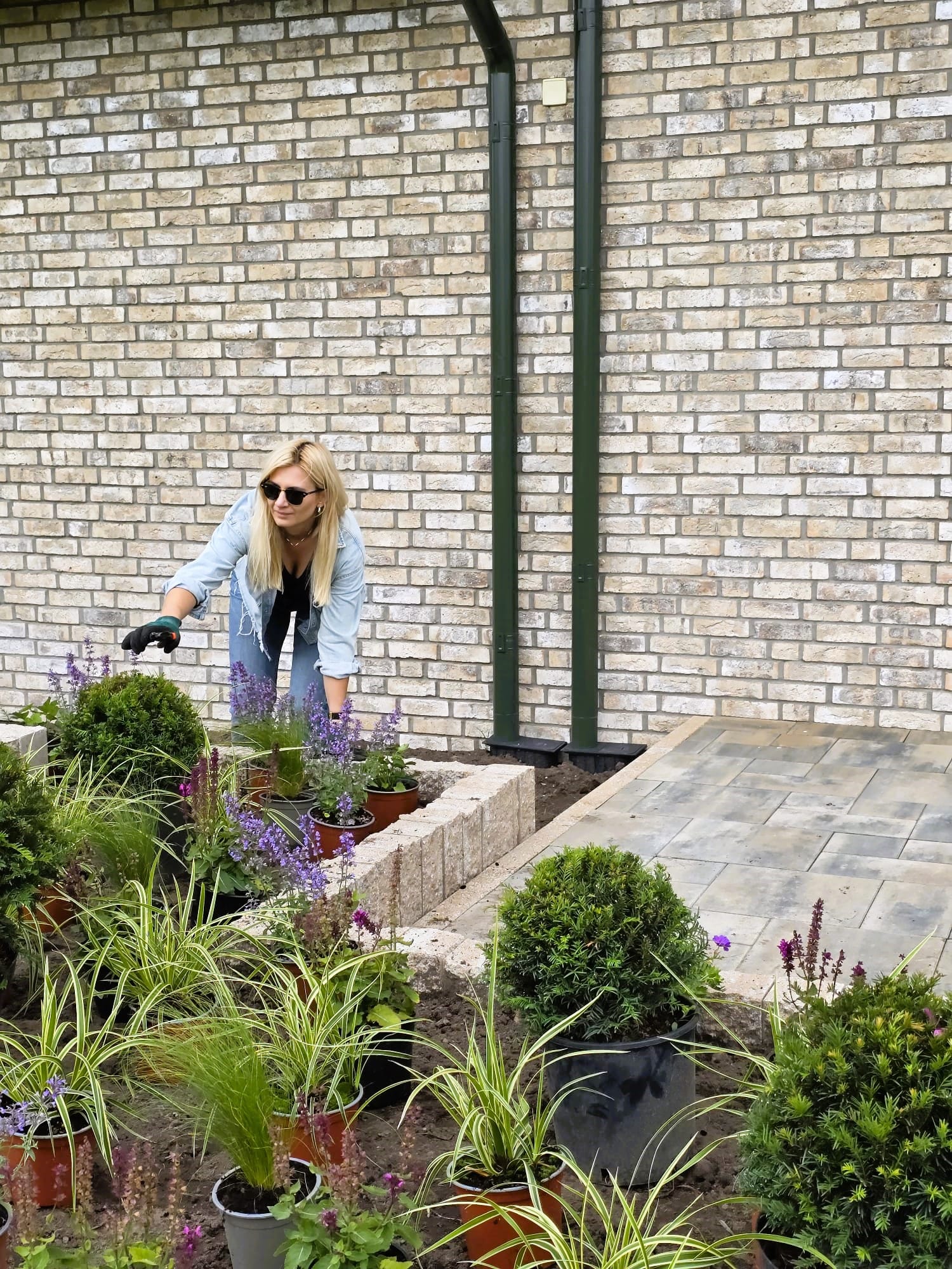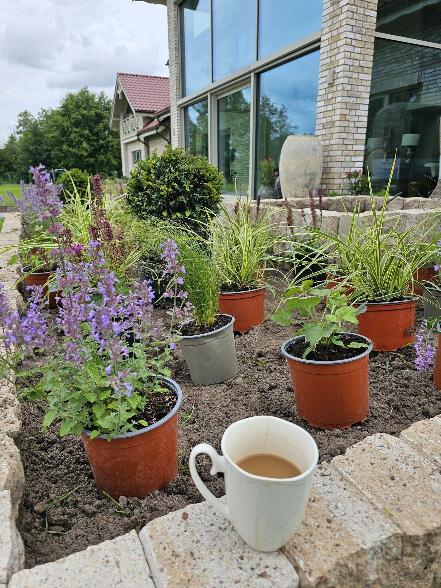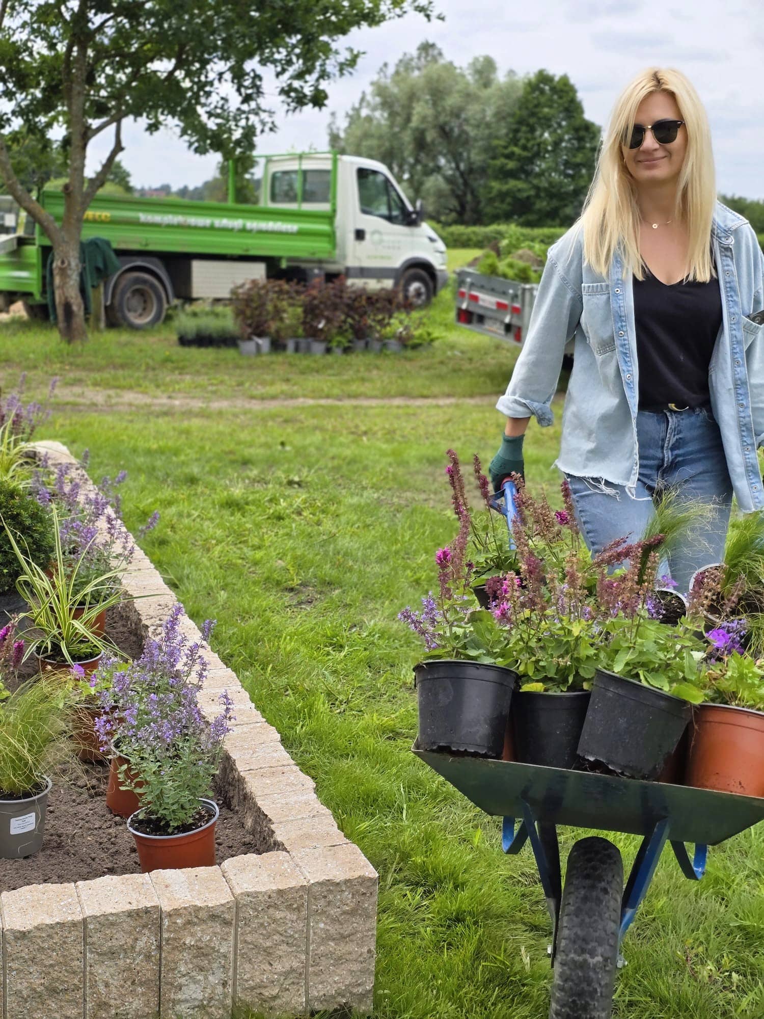 Ogród nad jeziorem Jeziorak zyskał wyjątkowy wygląd dzięki starannie zaprojektowanym rabatom bylinowym. Niektóre z nich zostały podniesione, co dodaje głębi przestrzeni. Całość urządzona jest w romantycznym, sielskim stylu, który idealnie komponuje się z malowniczym krajobrazem jeziora. W ogrodzie królują delikatne perowskie, trawy, które wprowadzają lekkość i ruch do przestrzeni. Ich subtelne kłosy kontrastują z intensywnym zapachem lawendy, która dodaje aromatycznego akcentu. Kuliste cisy, precyzyjnie formowane, nadają rabatom elegancki i uporządkowany wygląd, tworząc zielone, strukturalne elementy w ogrodzie atrakcyjne także zimą. Wśród nich wyróżniają się werbeny patagońskie, które swoim długim okresem kwitnienia i intensywnymi barwami wprowadzają kolorystyczną różnorodność.