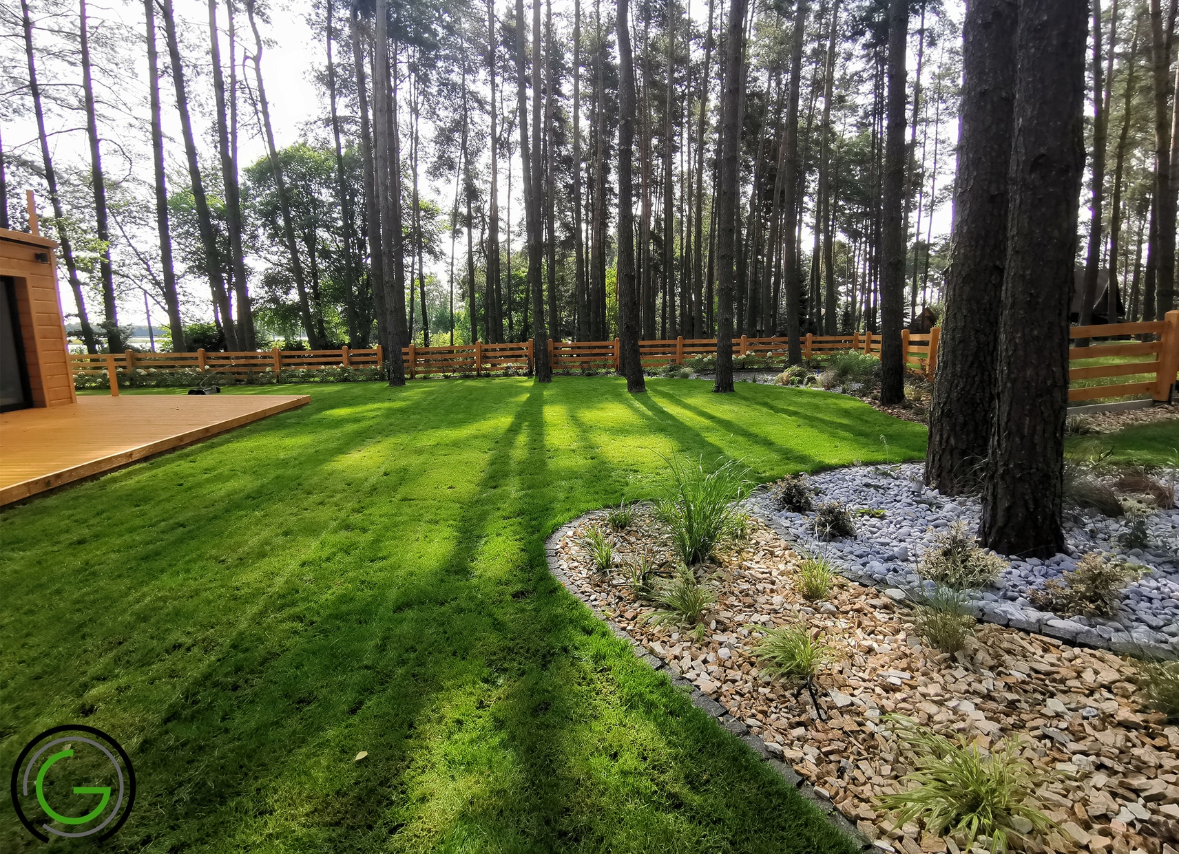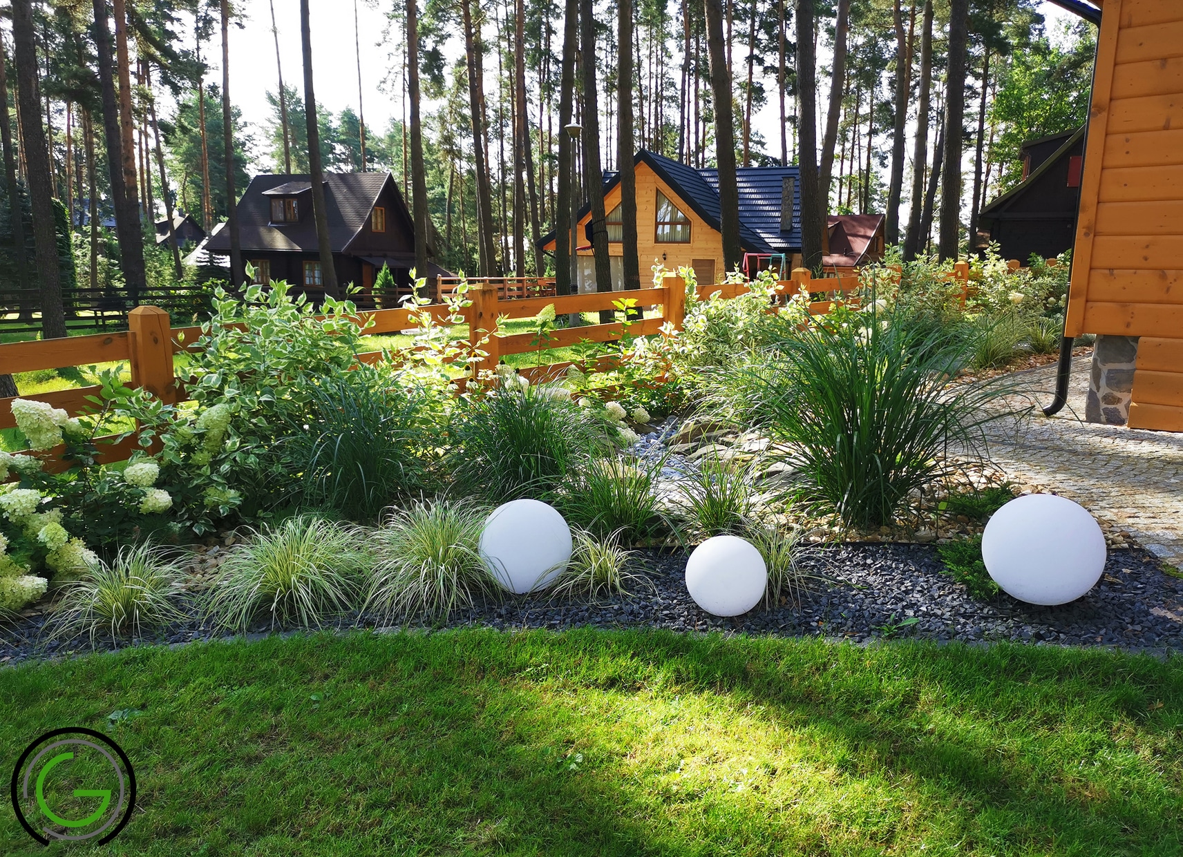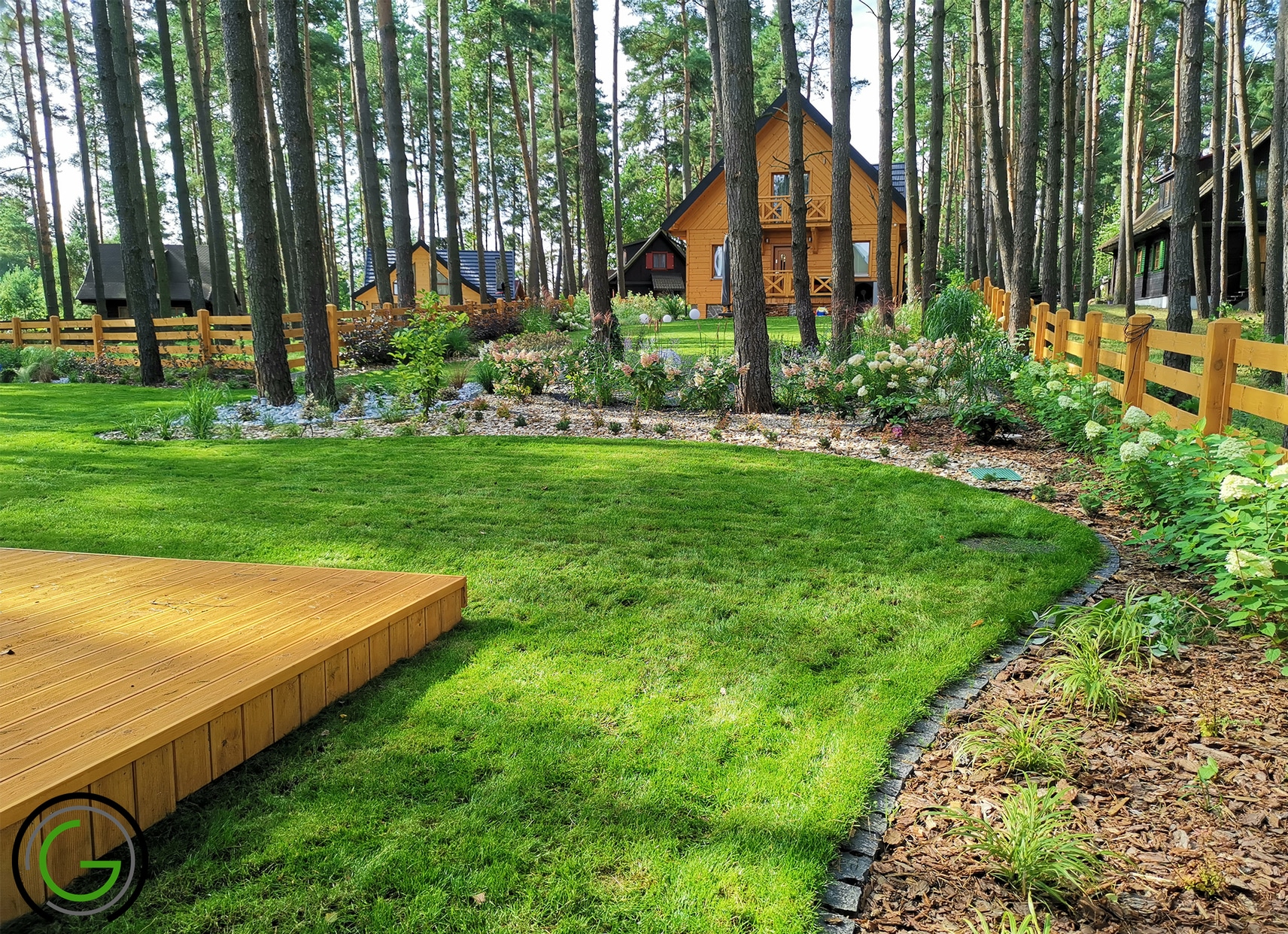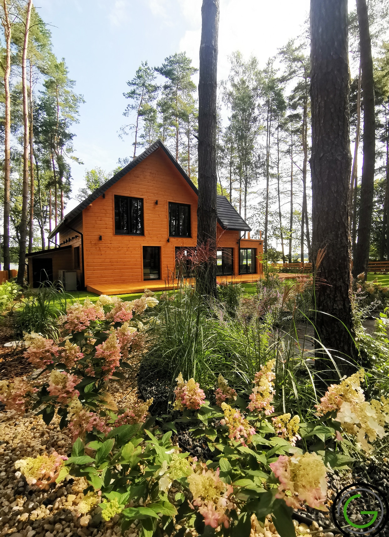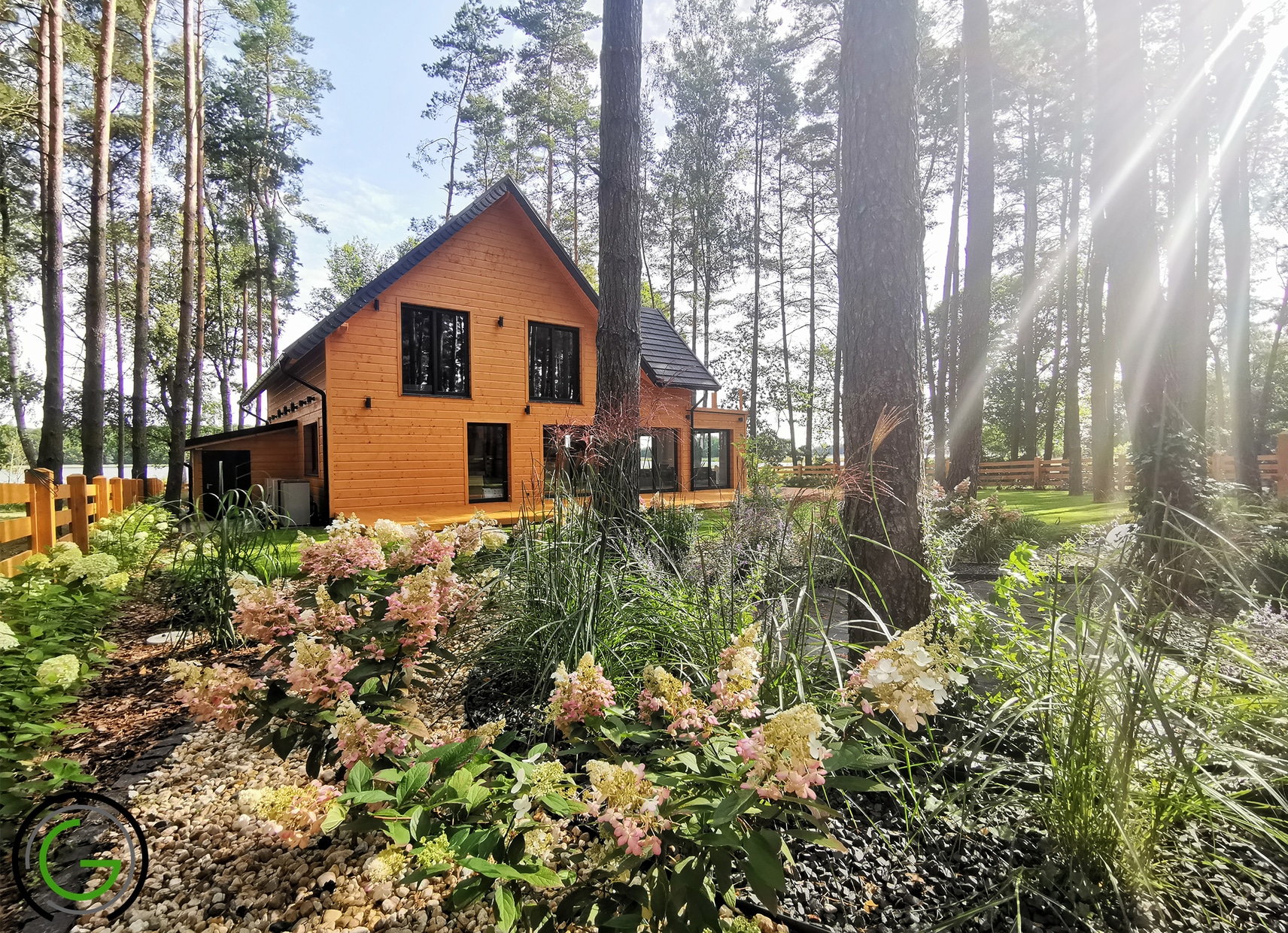 Ogród leśny przy dwóch domkach letniskowych urzeka swobodnym stylem, który doskonale wpisuje się w otaczającą go naturę. Przestrzeń została zaprojektowana z myślą o naturalnym pięknie, z zachowaniem lokalnego charakteru leśnego krajobrazu. Dominują w nim majestatyczne, naturalnie rosnące sosny, które tworzą malownicze tło i zapewniają przyjemny cień.