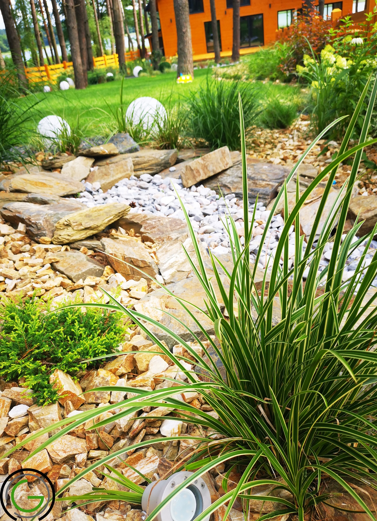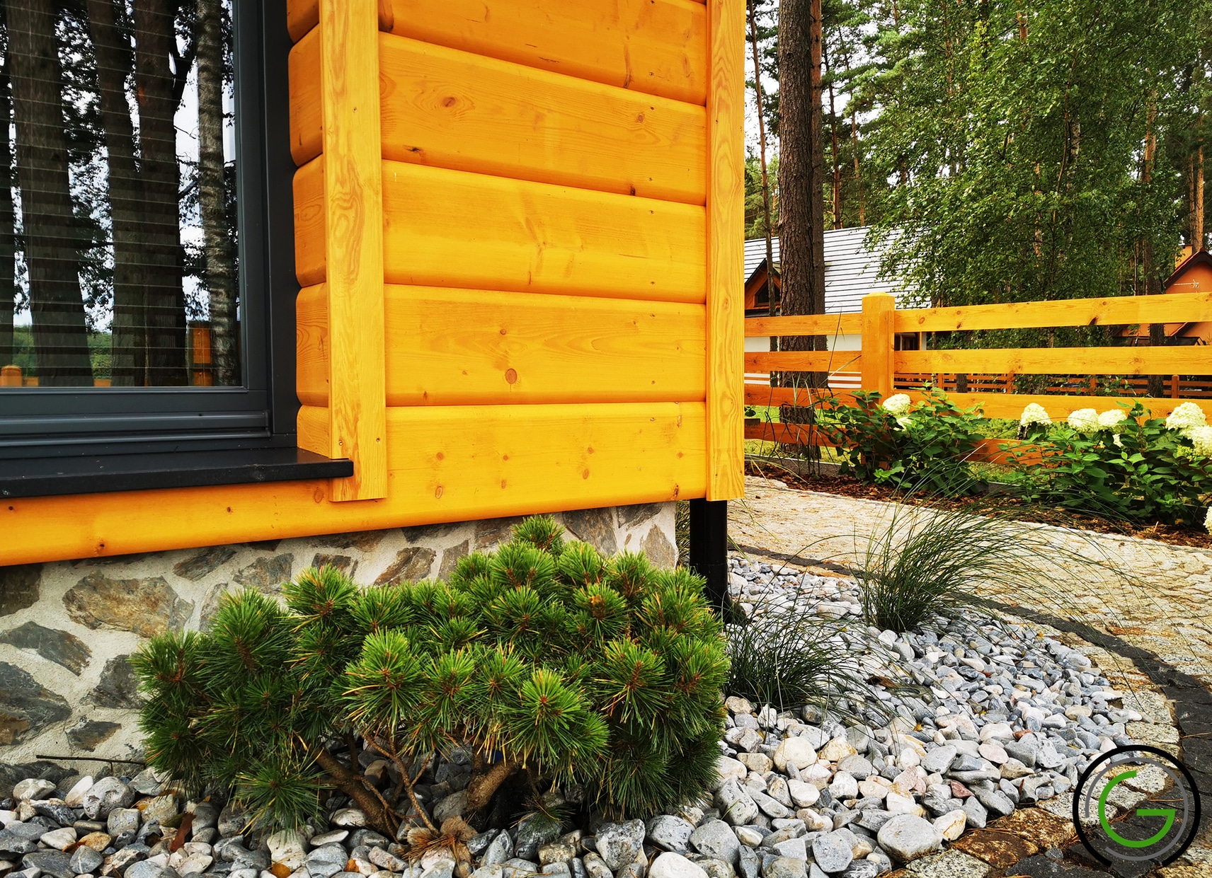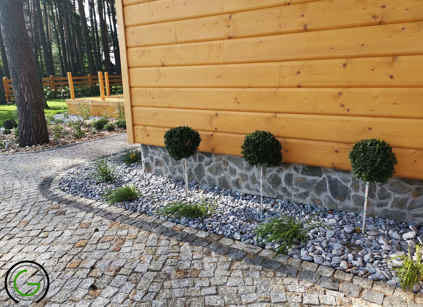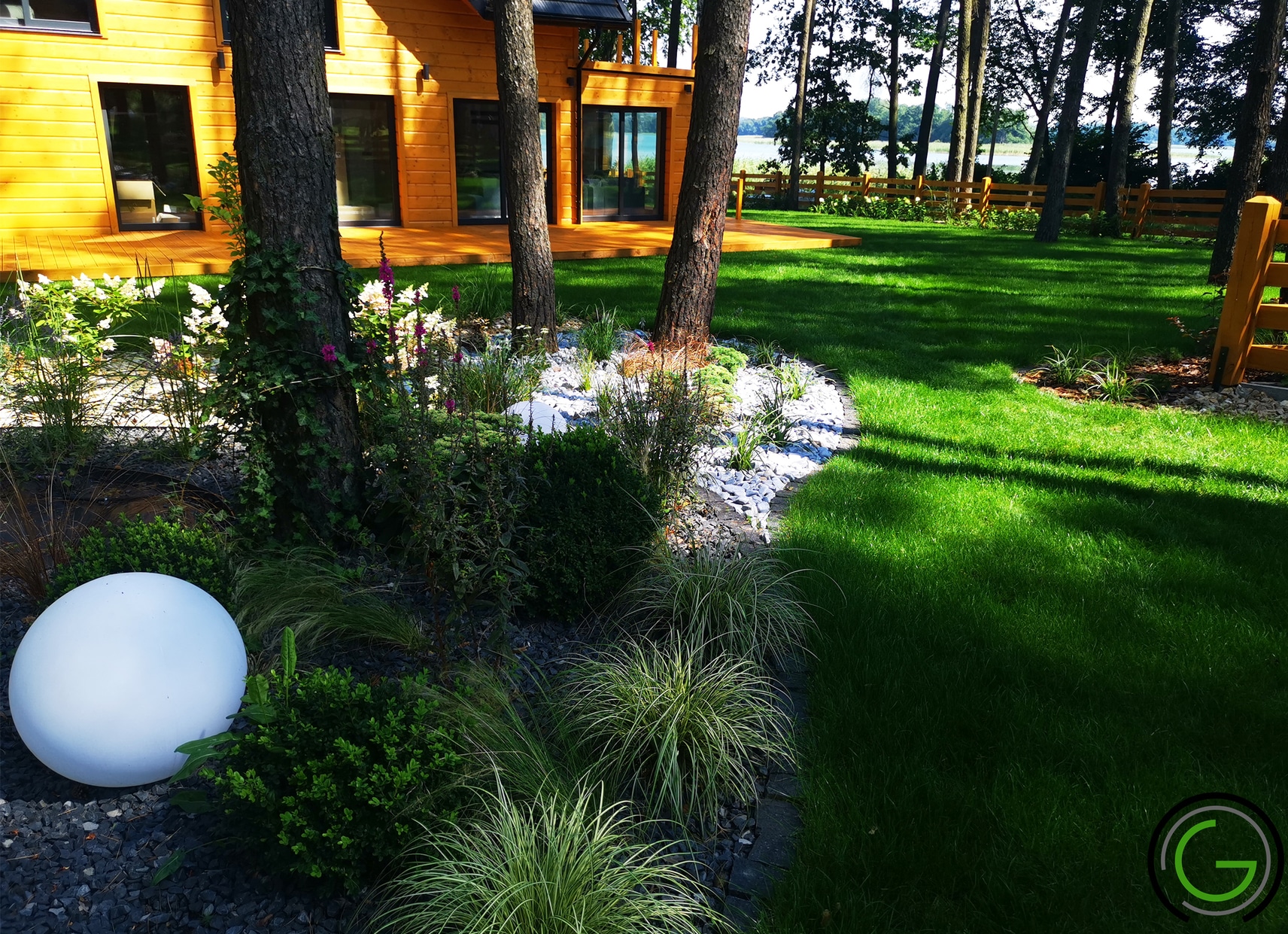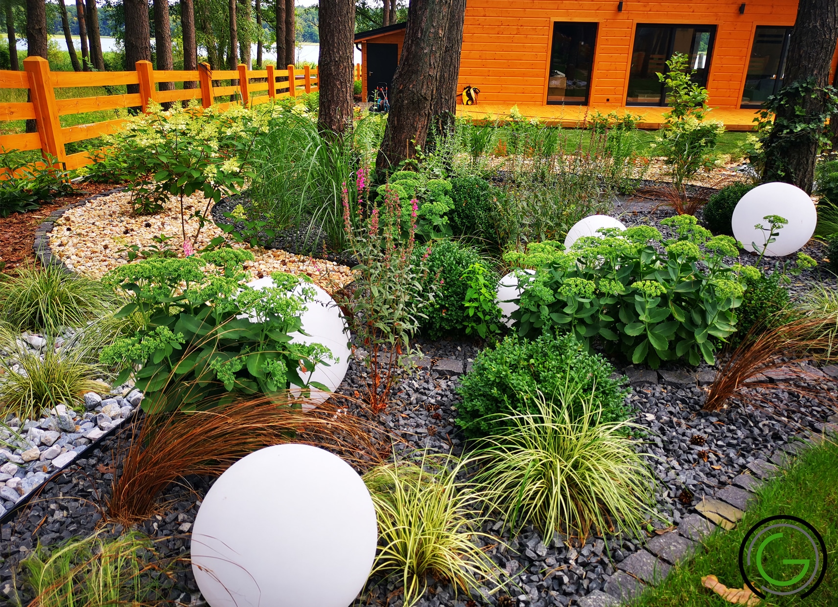 Ogród leśny przy dwóch domkach letniskowych urzeka swobodnym stylem, który doskonale wpisuje się w otaczającą go naturę. Przestrzeń została zaprojektowana z myślą o naturalnym pięknie, z zachowaniem lokalnego charakteru leśnego krajobrazu. Dominują w nim majestatyczne, naturalnie rosnące sosny, które tworzą malownicze tło i zapewniają przyjemny cień.
