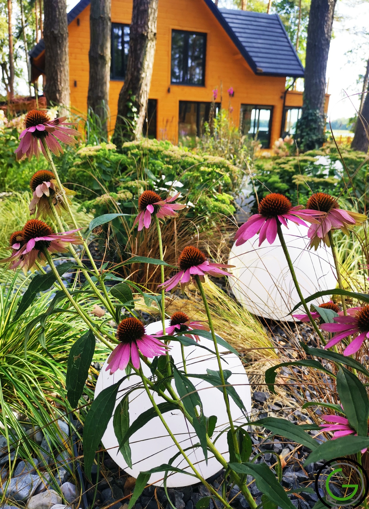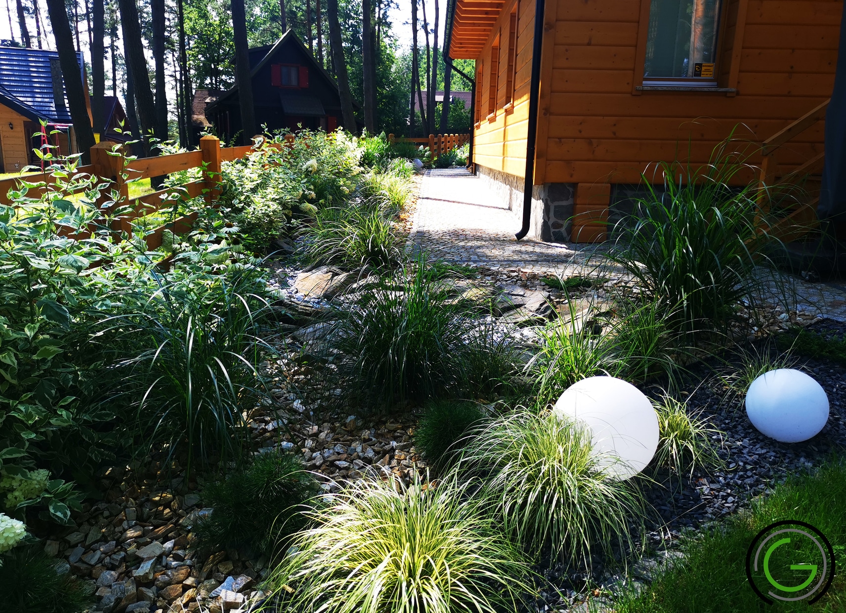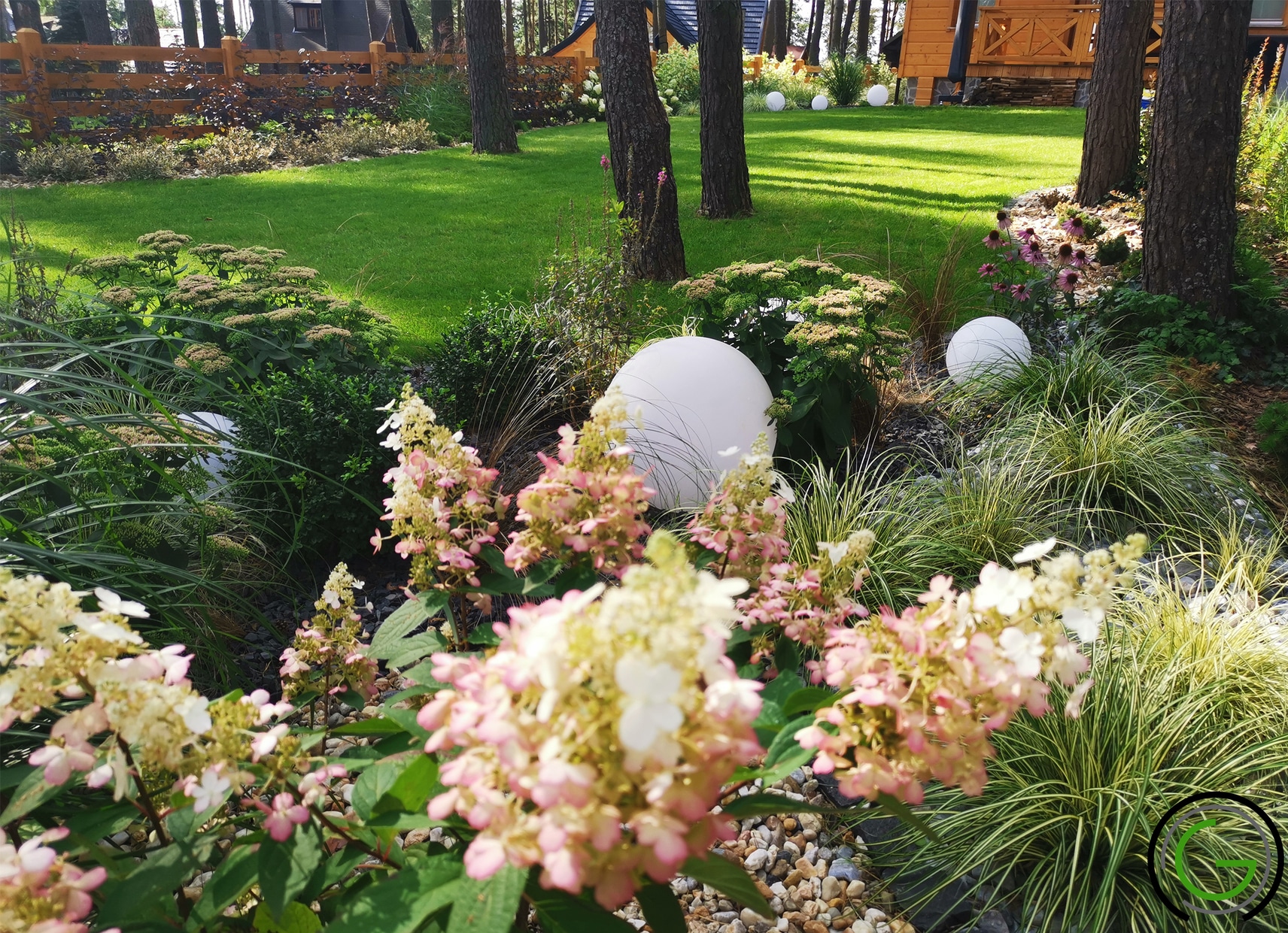 W ogrodzie królują hortensje i ozdobne trawy, które wprowadzają kolor i teksturę, kontrastując z zielenią iglastych drzew. Hortensje, w zależności od pory roku, zachwycają bogatą paletą barw, od delikatnych pasteli po intensywne odcienie. Ozdobne trawy dodają lekkości i ruchu, wprowadzając naturalny urok i dynamiczne elementy do przestrzeni. Swobodny styl ogrodu sprzyja relaksowi, idealnie łącząc komfort letniskowego wypoczynku z pięknem dzikiej natury. Całość tworzy przytulną, naturalną przestrzeń, zachęcającą do spędzania czasu na świeżym powietrzu.