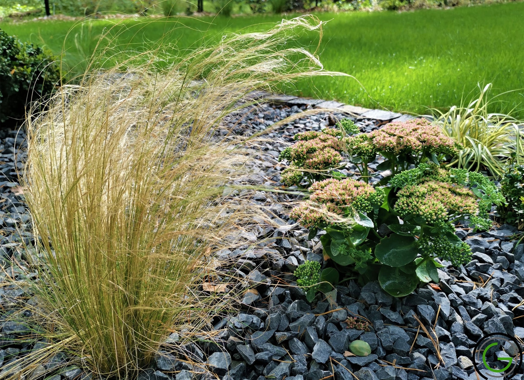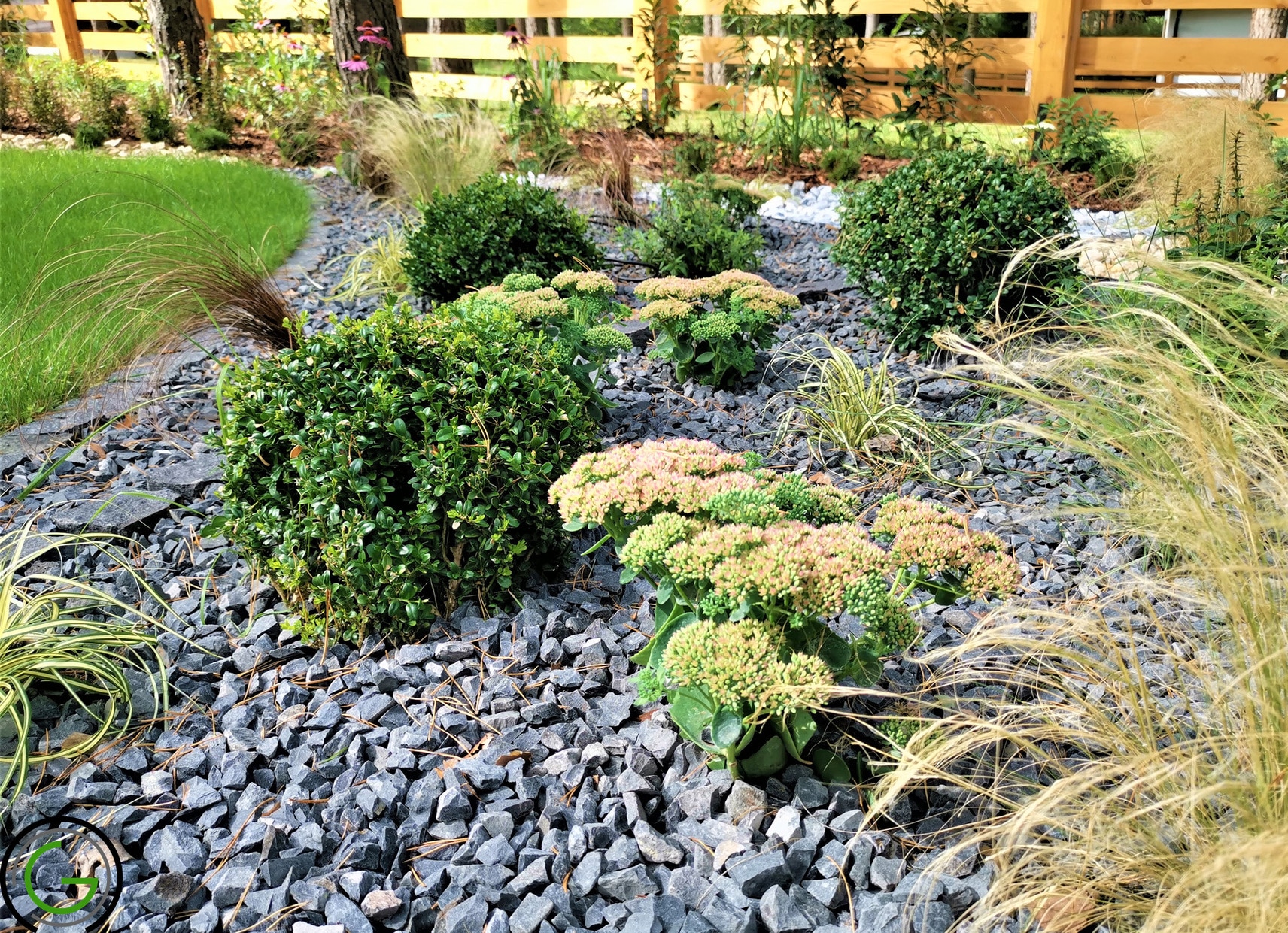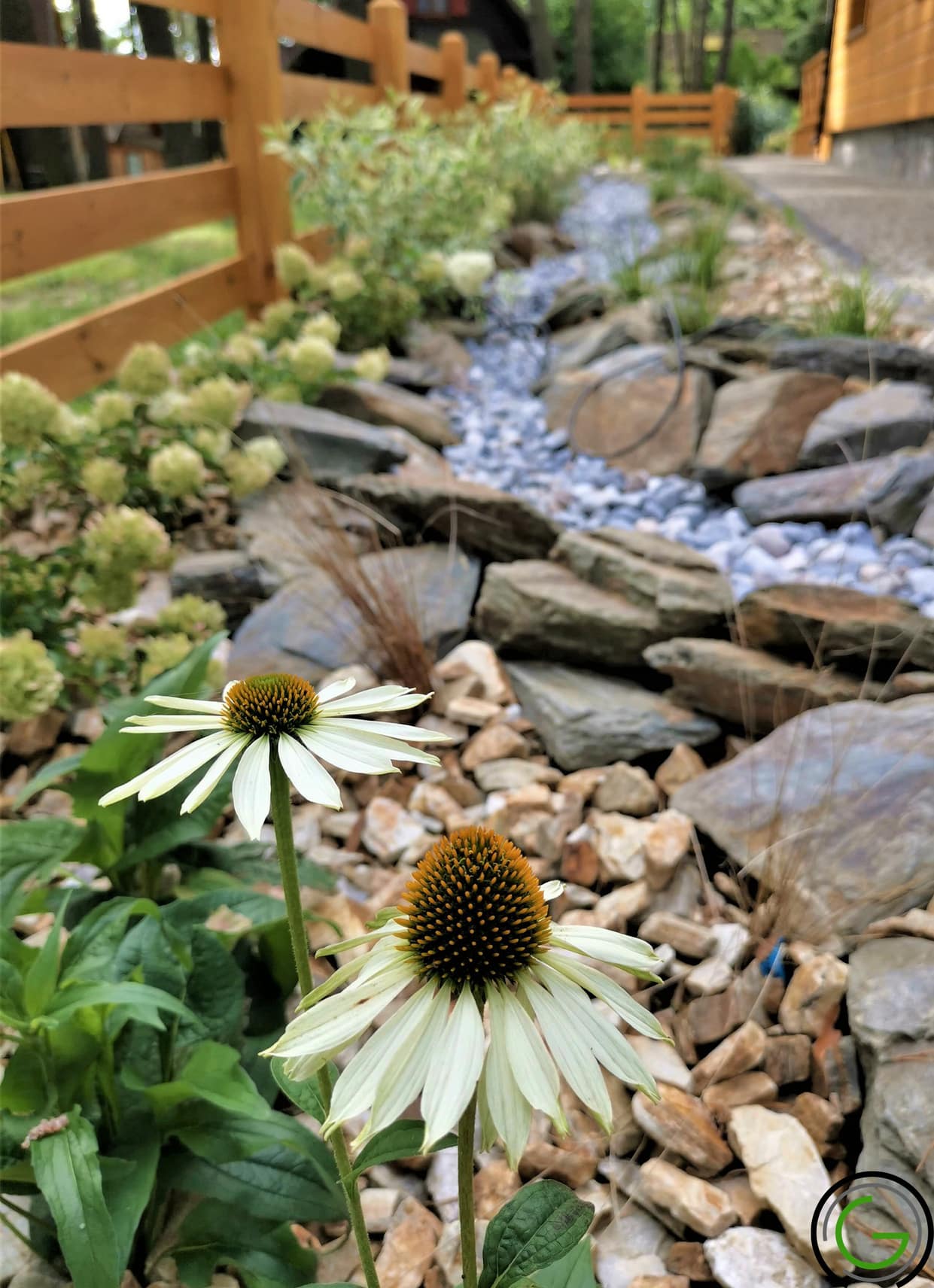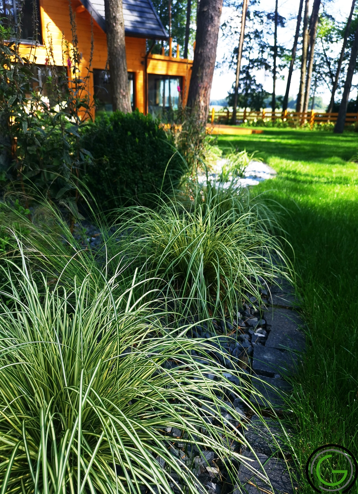 W ogrodzie królują hortensje i ozdobne trawy, które wprowadzają kolor i teksturę, kontrastując z zielenią iglastych drzew. Hortensje, w zależności od pory roku, zachwycają bogatą paletą barw, od delikatnych pasteli po intensywne odcienie. Ozdobne trawy dodają lekkości i ruchu, wprowadzając naturalny urok i dynamiczne elementy do przestrzeni. Swobodny styl ogrodu sprzyja relaksowi, idealnie łącząc komfort letniskowego wypoczynku z pięknem dzikiej natury. Całość tworzy przytulną, naturalną przestrzeń, zachęcającą do spędzania czasu na świeżym powietrzu.