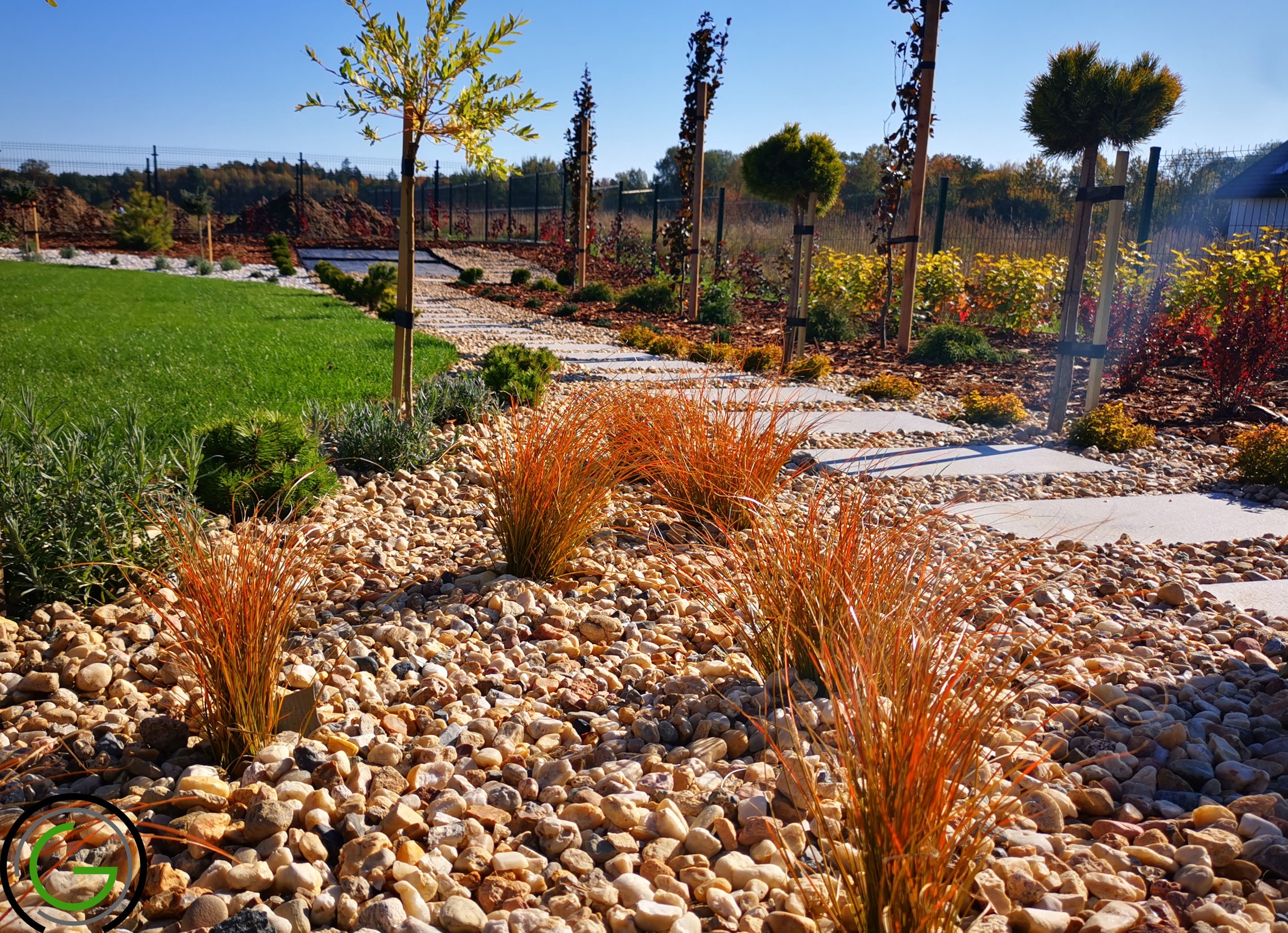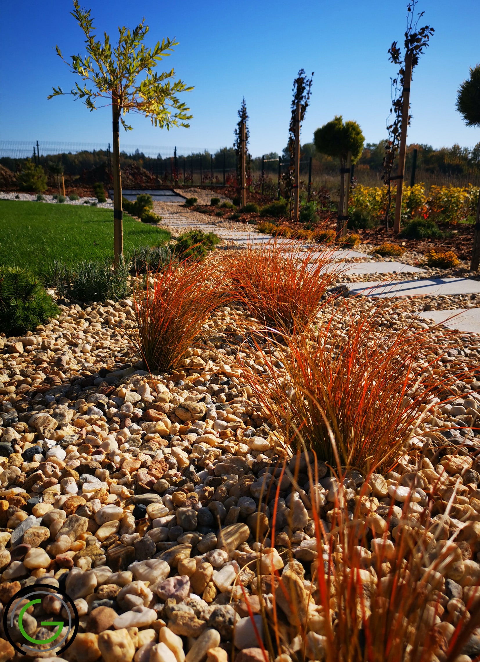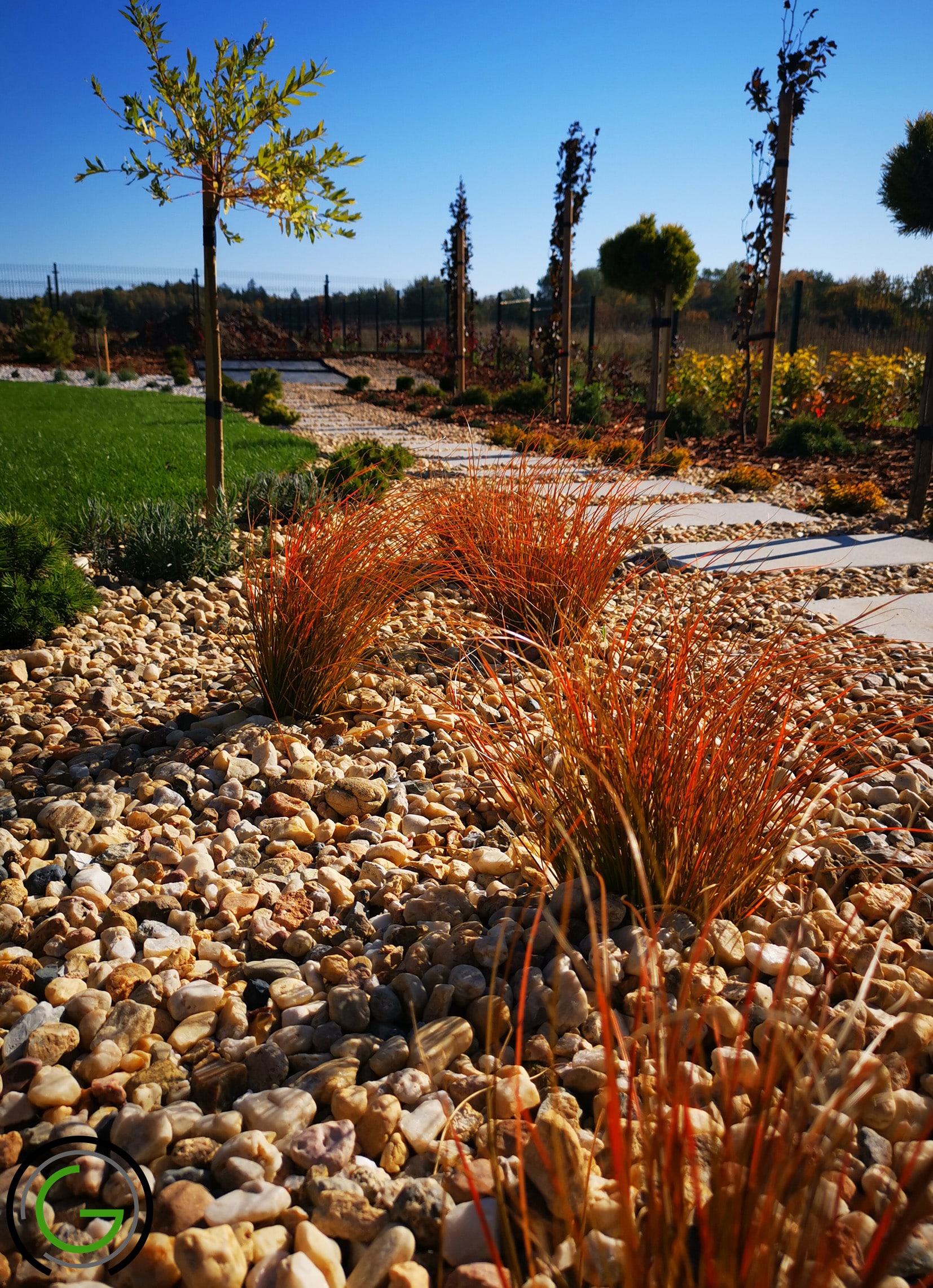 Zadbano o łatwe w utrzymaniu nasadzenia – niewielkie rabaty z ozdobnymi trawami i roślinami wieloletnimi, które nie wymagają częstej pielęgnacji, wprowadzają zielony akcent i naturalny urok.