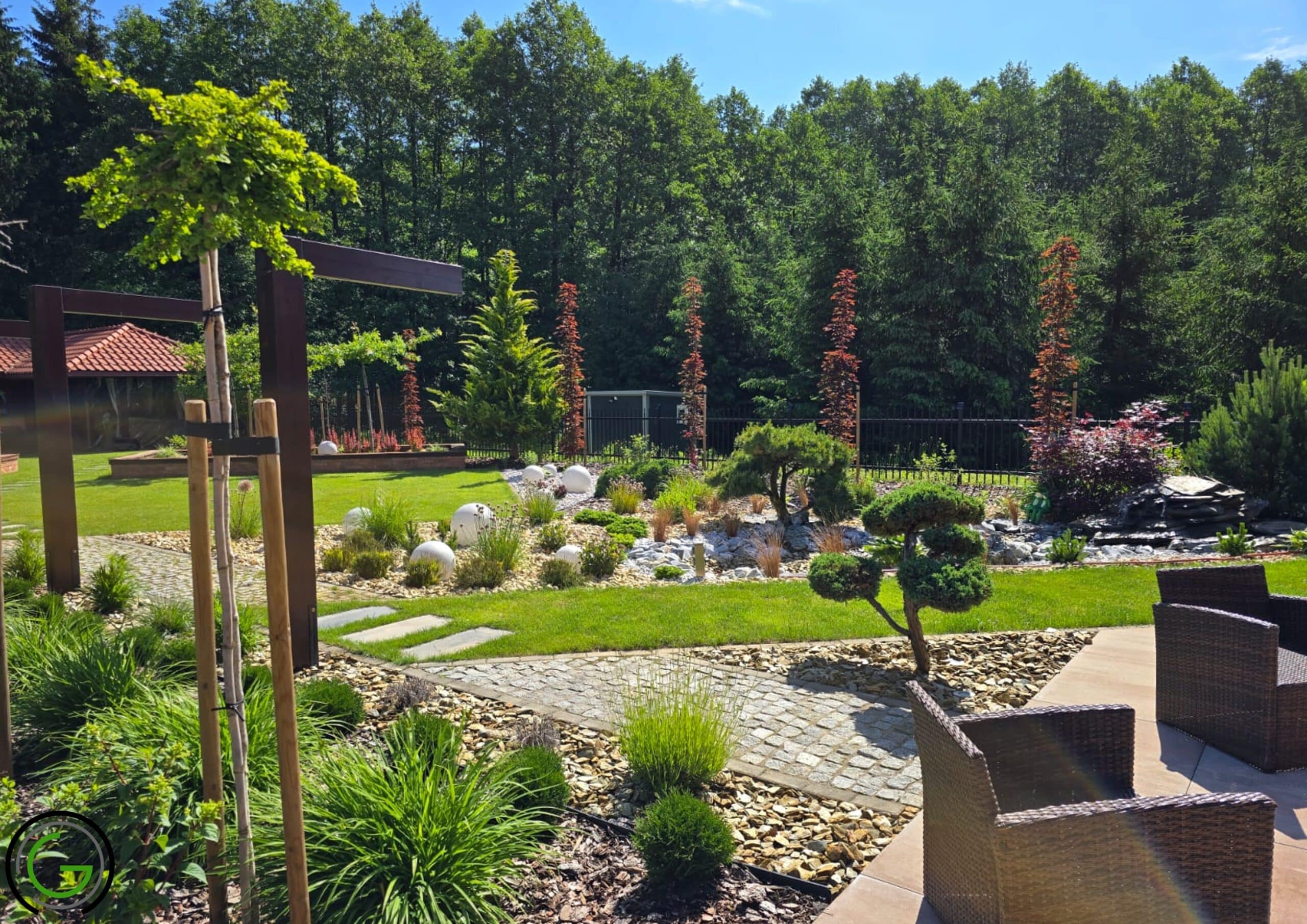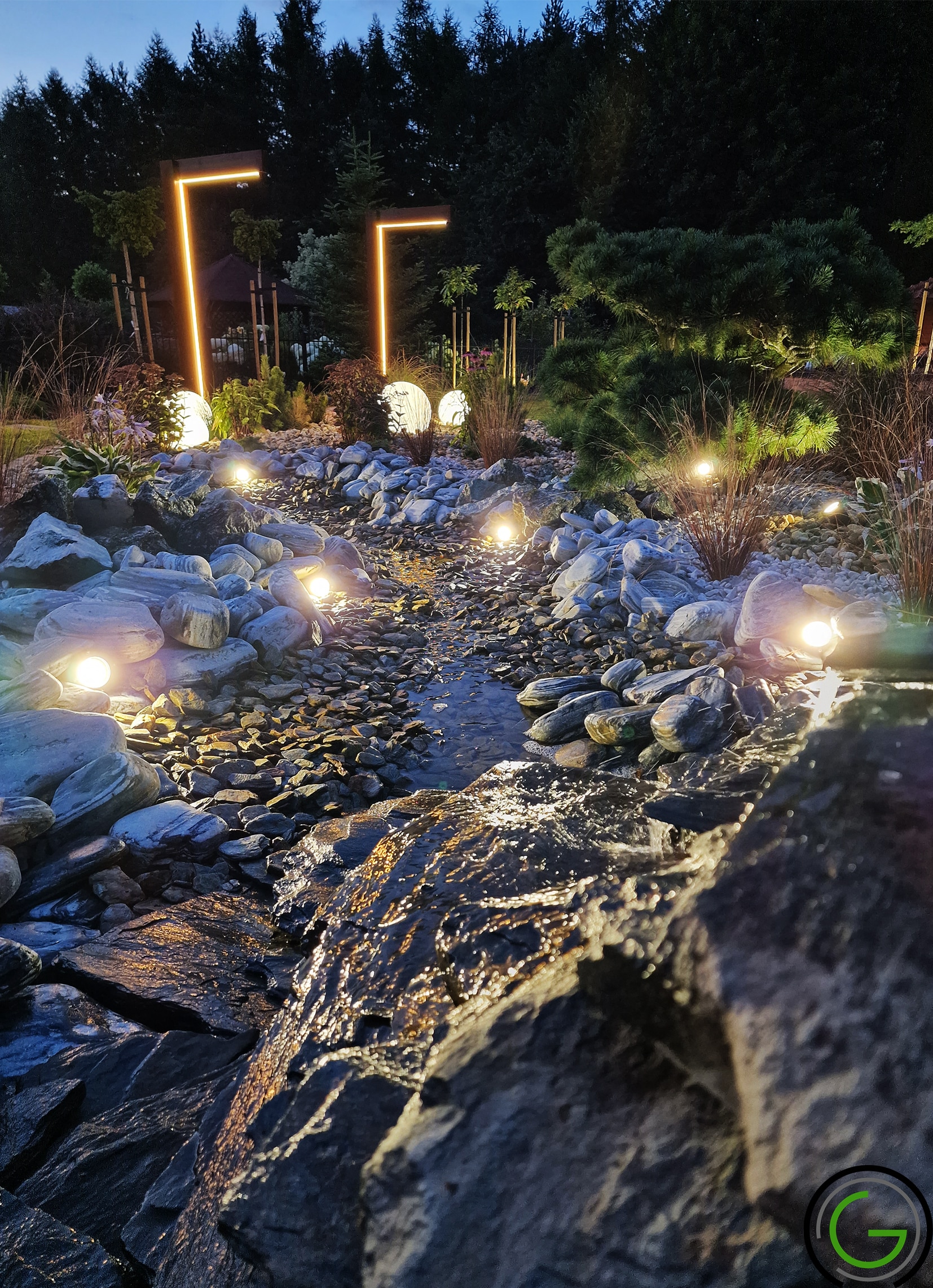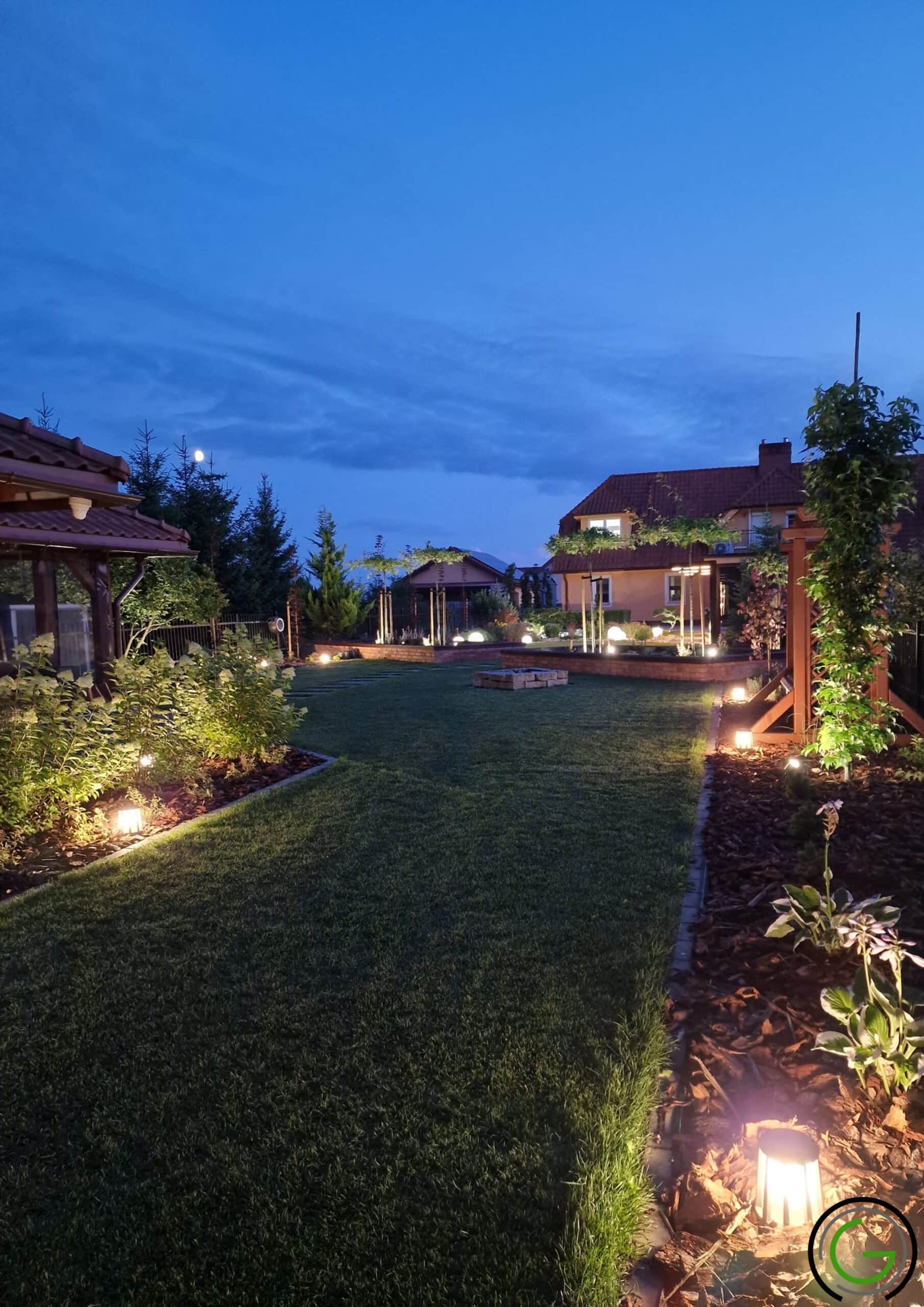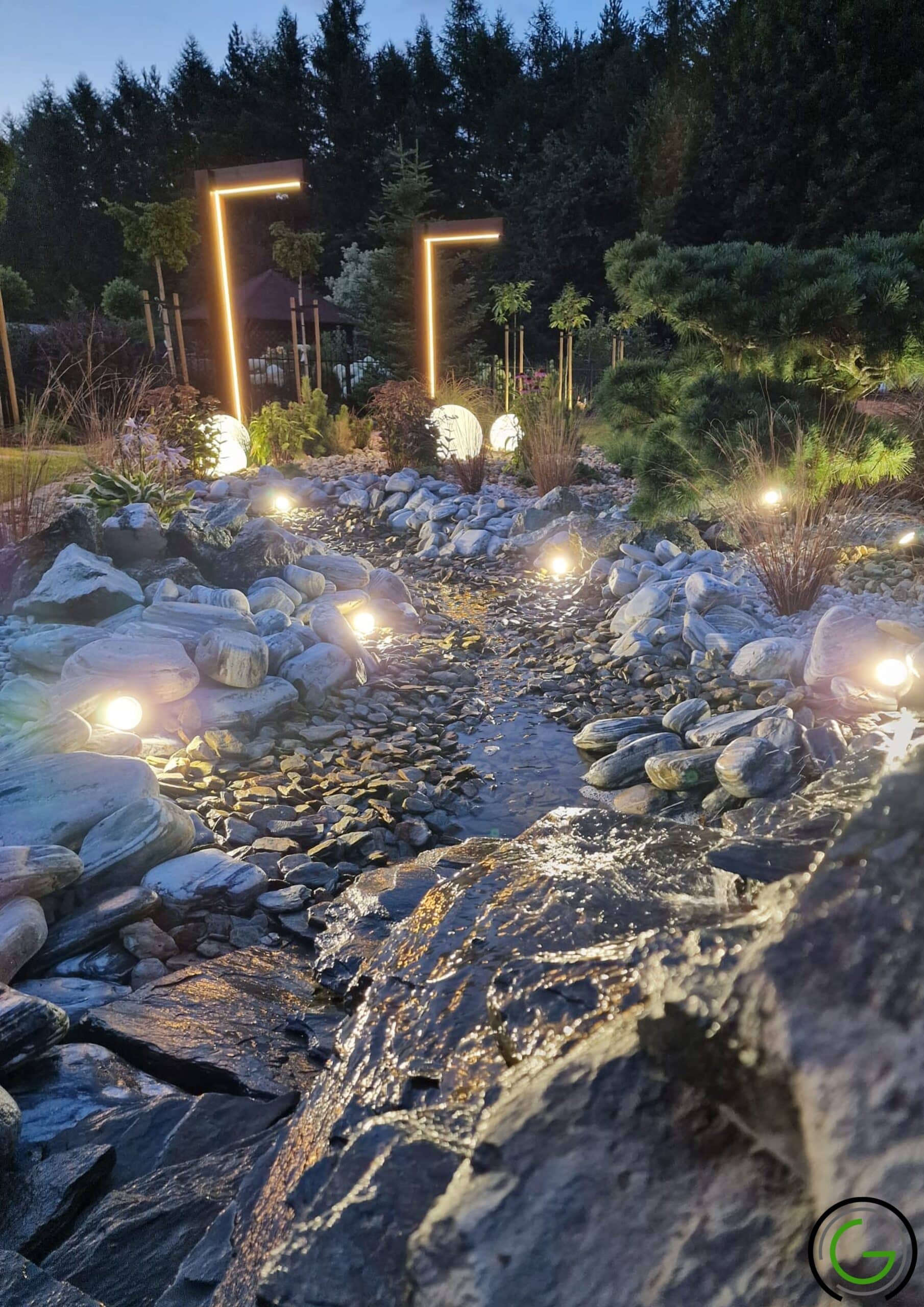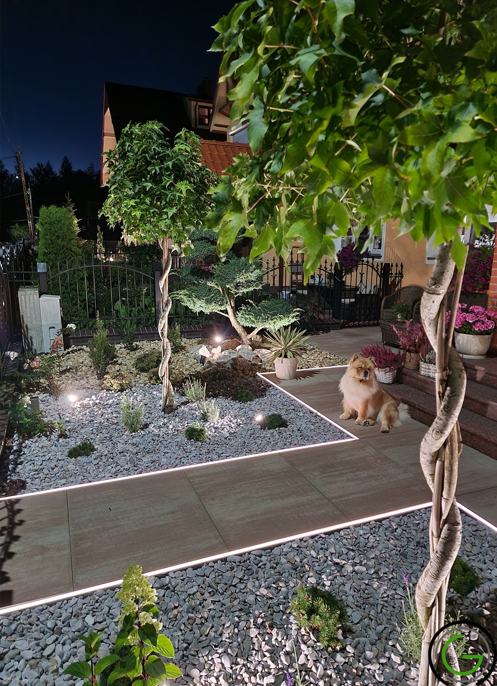 W kolejnej przebudowie ogrodu również zachowano oryginalny układ rabat oraz trawników, wprowadzając jednocześnie subtelny lifting istniejących elementów małej architektury, takich jak strumień czy murowane donice. Całość została uporządkowana za pomocą , tworząc spójny i przemyślany układ, który podkreśla piękno każdego zakątka ogrodu. Dodatkowo wprowadzono nowoczesne oświetlenie – listwy LED zamontowane w półpergoli oraz dyskretne podświetlenie LED przy nawierzchniach, które nadają przestrzeni efektowny wygląd po zmroku. Dzięki tym zmianom ogród zyskał elegancki, nowoczesny styl, idealnie łączący funkcjonalność z estetyką, oferując spokojne, uporządkowane miejsce do wypoczynku.
