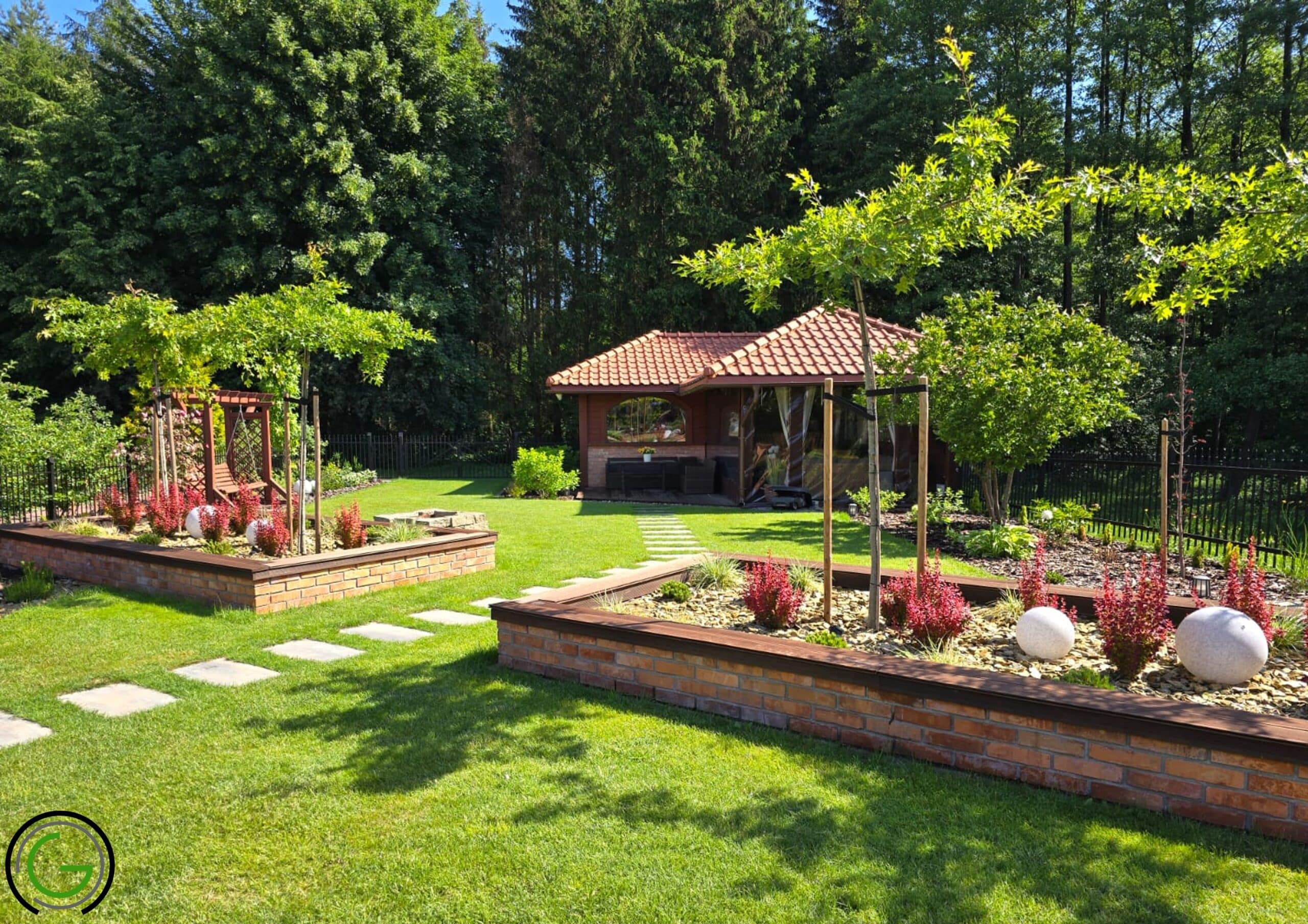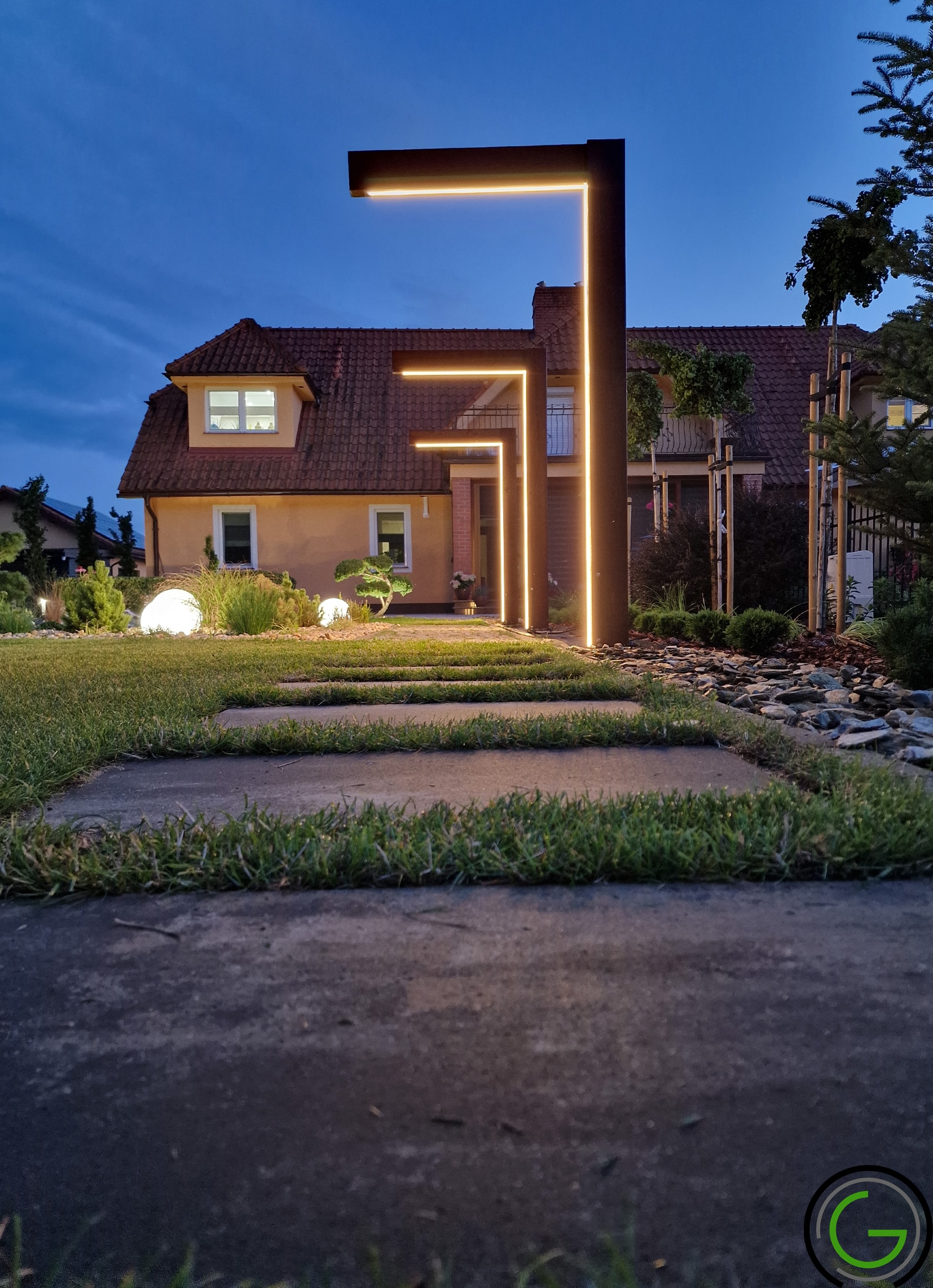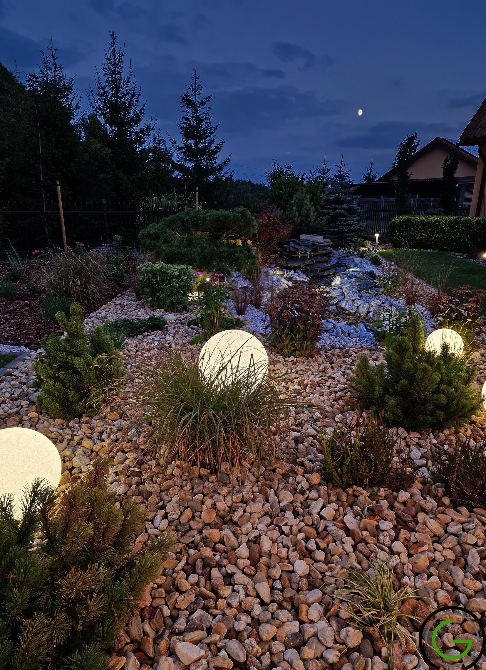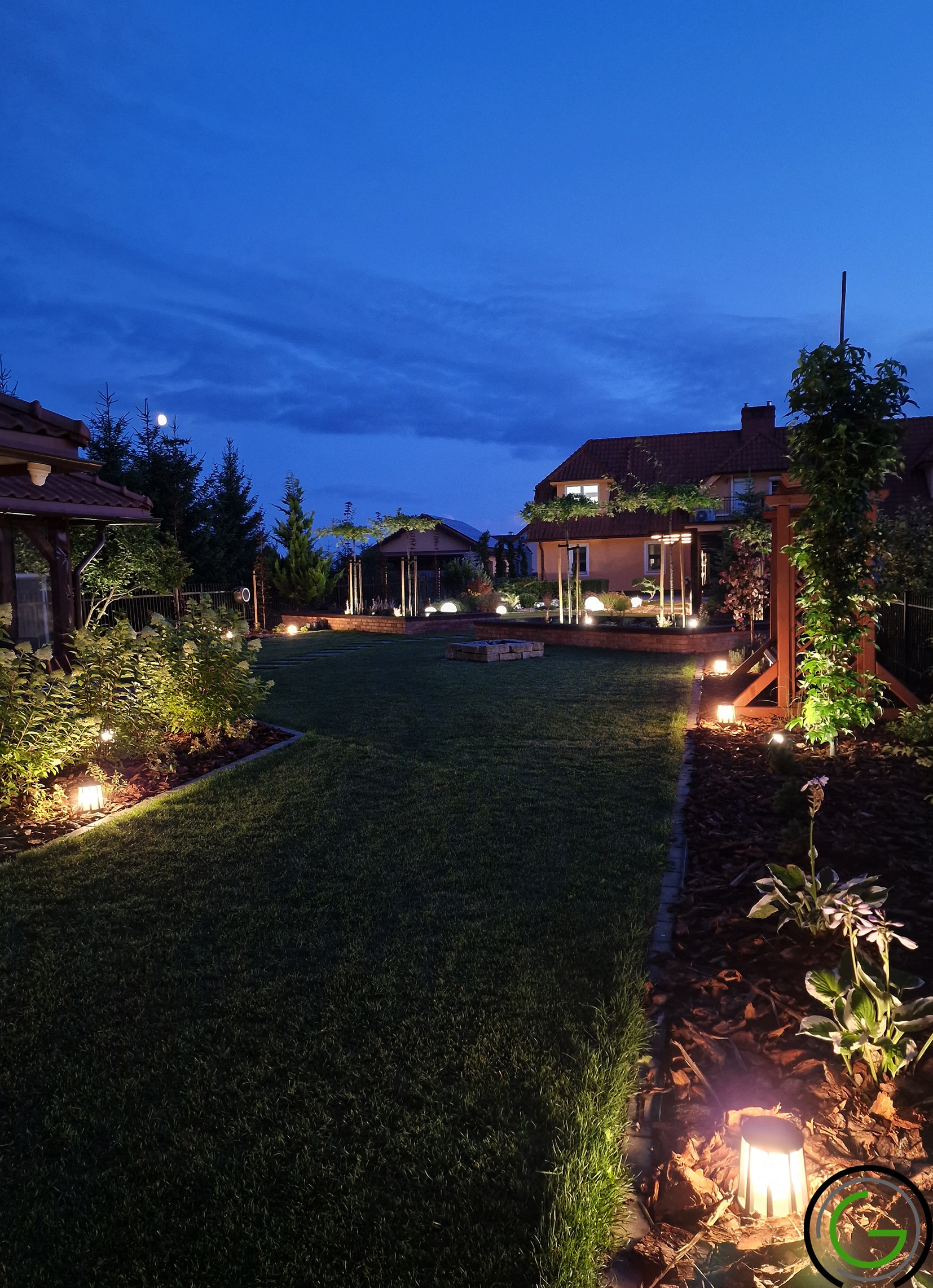 W kolejnej przebudowie ogrodu również zachowano oryginalny układ rabat oraz trawników, wprowadzając jednocześnie subtelny lifting istniejących elementów małej architektury, takich jak strumień czy murowane donice. Całość została uporządkowana za pomocą , tworząc spójny i przemyślany układ, który podkreśla piękno każdego zakątka ogrodu. Dodatkowo wprowadzono nowoczesne oświetlenie – listwy LED zamontowane w półpergoli oraz dyskretne podświetlenie LED przy nawierzchniach, które nadają przestrzeni efektowny wygląd po zmroku. Dzięki tym zmianom ogród zyskał elegancki, nowoczesny styl, idealnie łączący funkcjonalność z estetyką, oferując spokojne, uporządkowane miejsce do wypoczynku.
