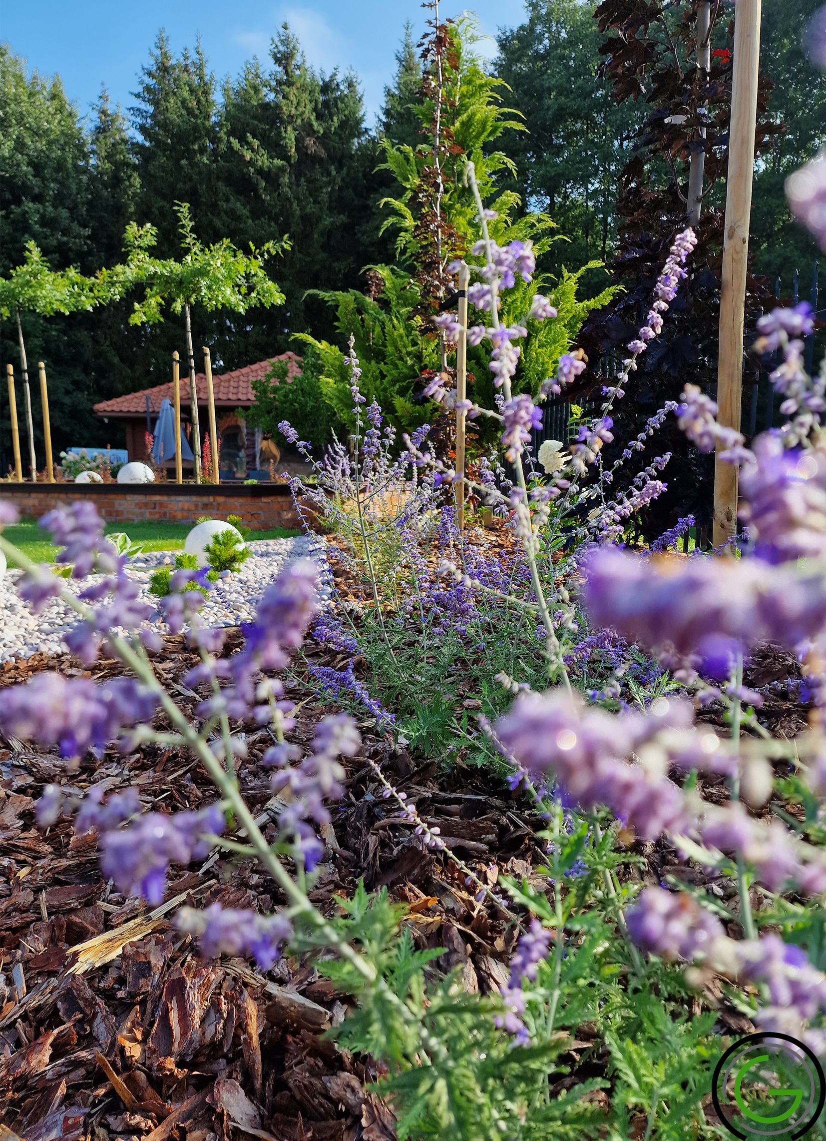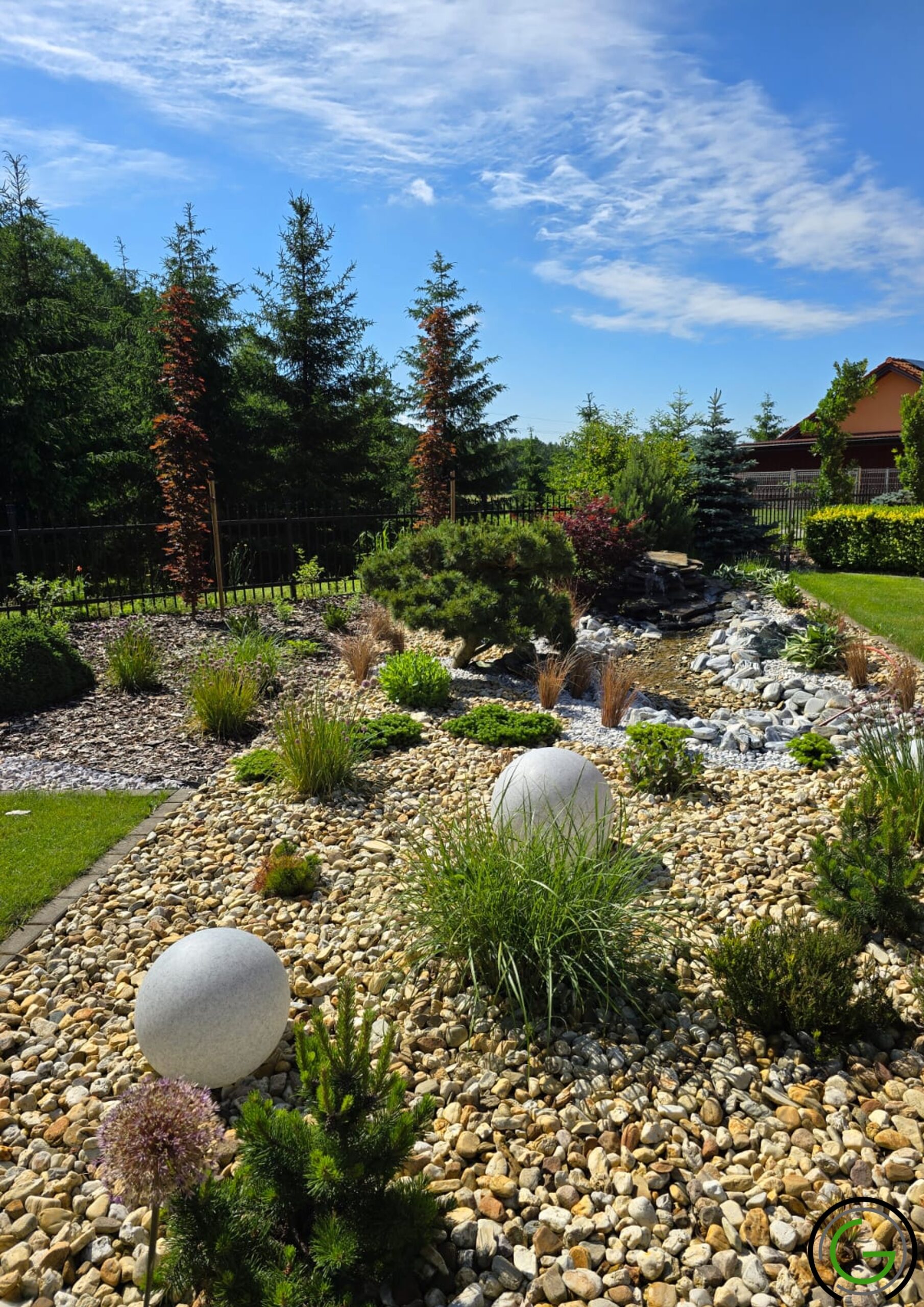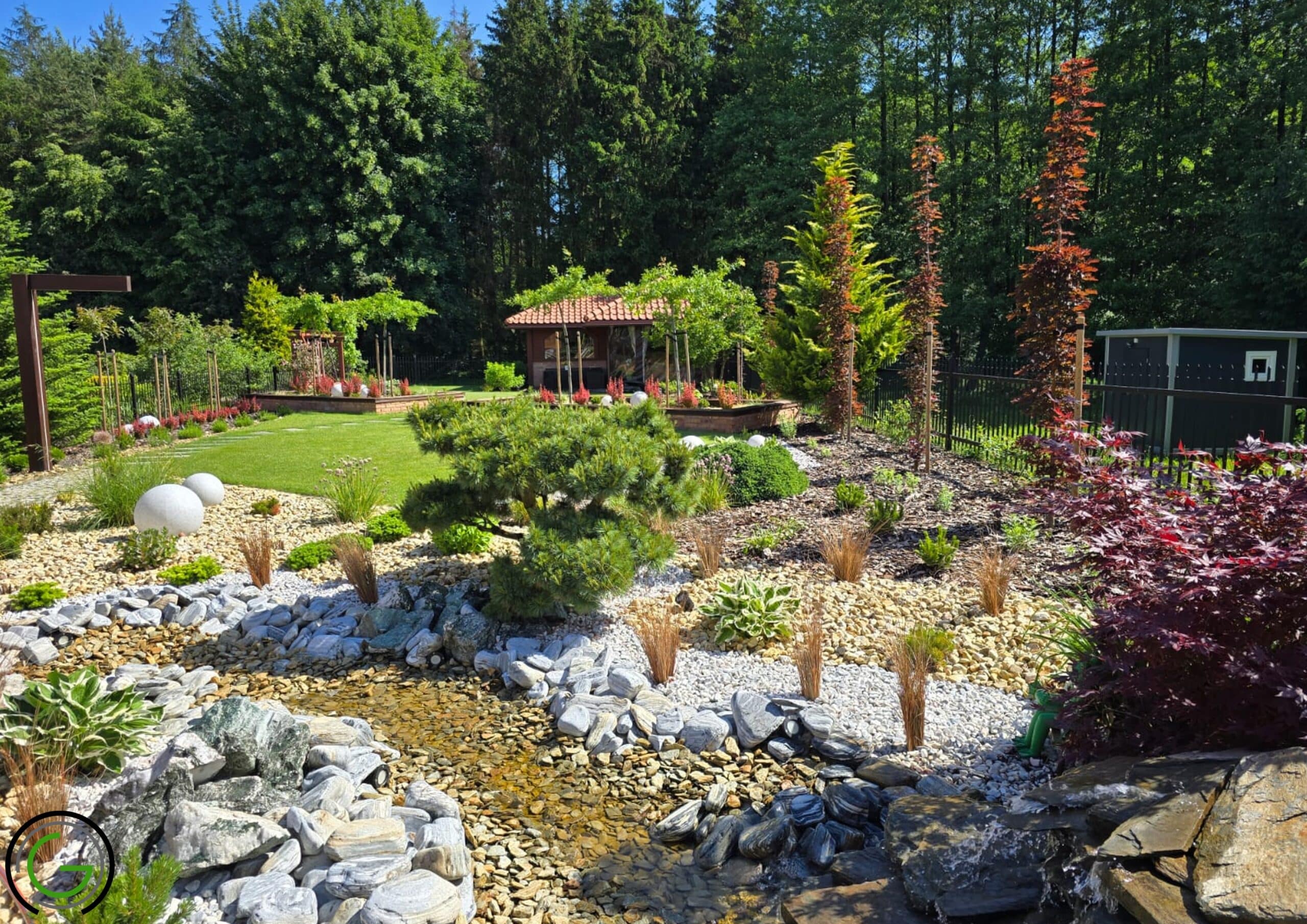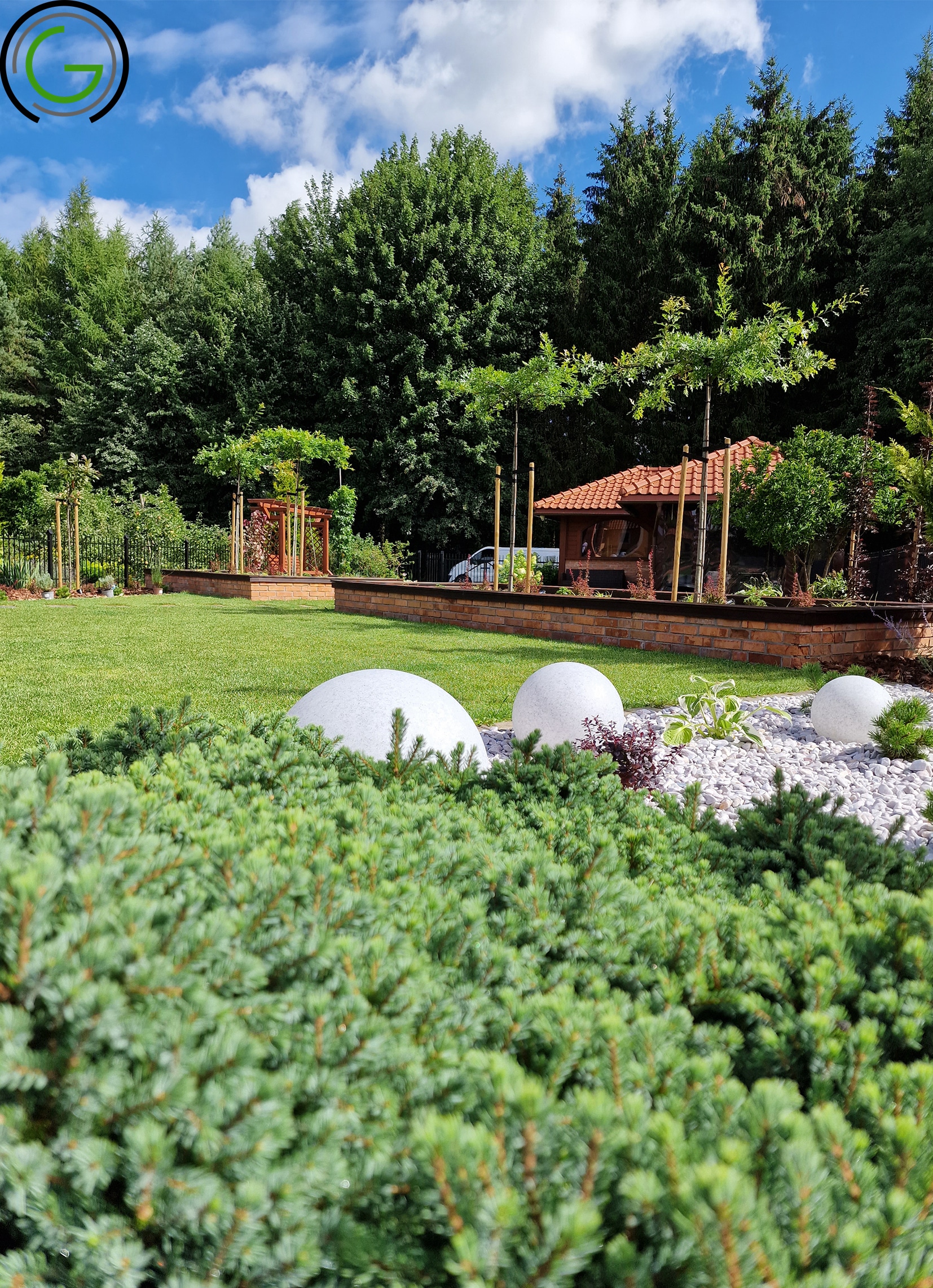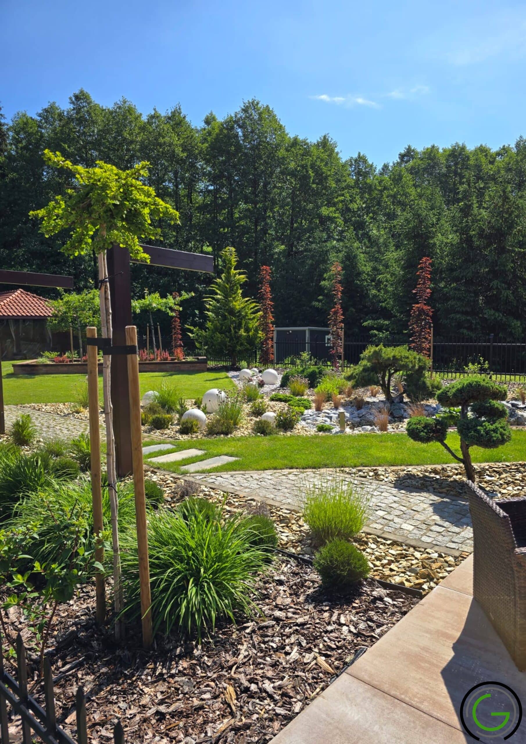 W kolejnej przebudowie ogrodu również zachowano oryginalny układ rabat oraz trawników, wprowadzając jednocześnie subtelny lifting istniejących elementów małej architektury, takich jak strumień czy murowane donice. Całość została uporządkowana za pomocą , tworząc spójny i przemyślany układ, który podkreśla piękno każdego zakątka ogrodu. Dodatkowo wprowadzono nowoczesne oświetlenie – listwy LED zamontowane w półpergoli oraz dyskretne podświetlenie LED przy nawierzchniach, które nadają przestrzeni efektowny wygląd po zmroku. Dzięki tym zmianom ogród zyskał elegancki, nowoczesny styl, idealnie łączący funkcjonalność z estetyką, oferując spokojne, uporządkowane miejsce do wypoczynku.