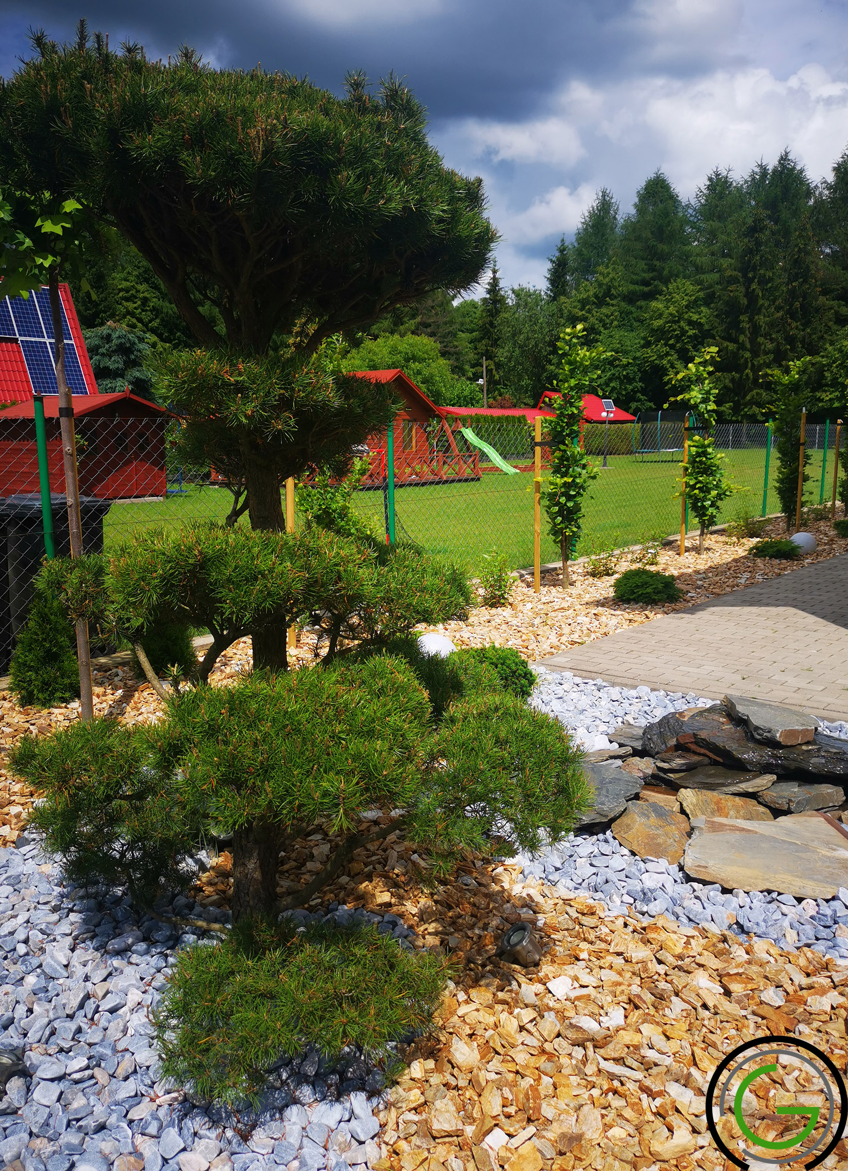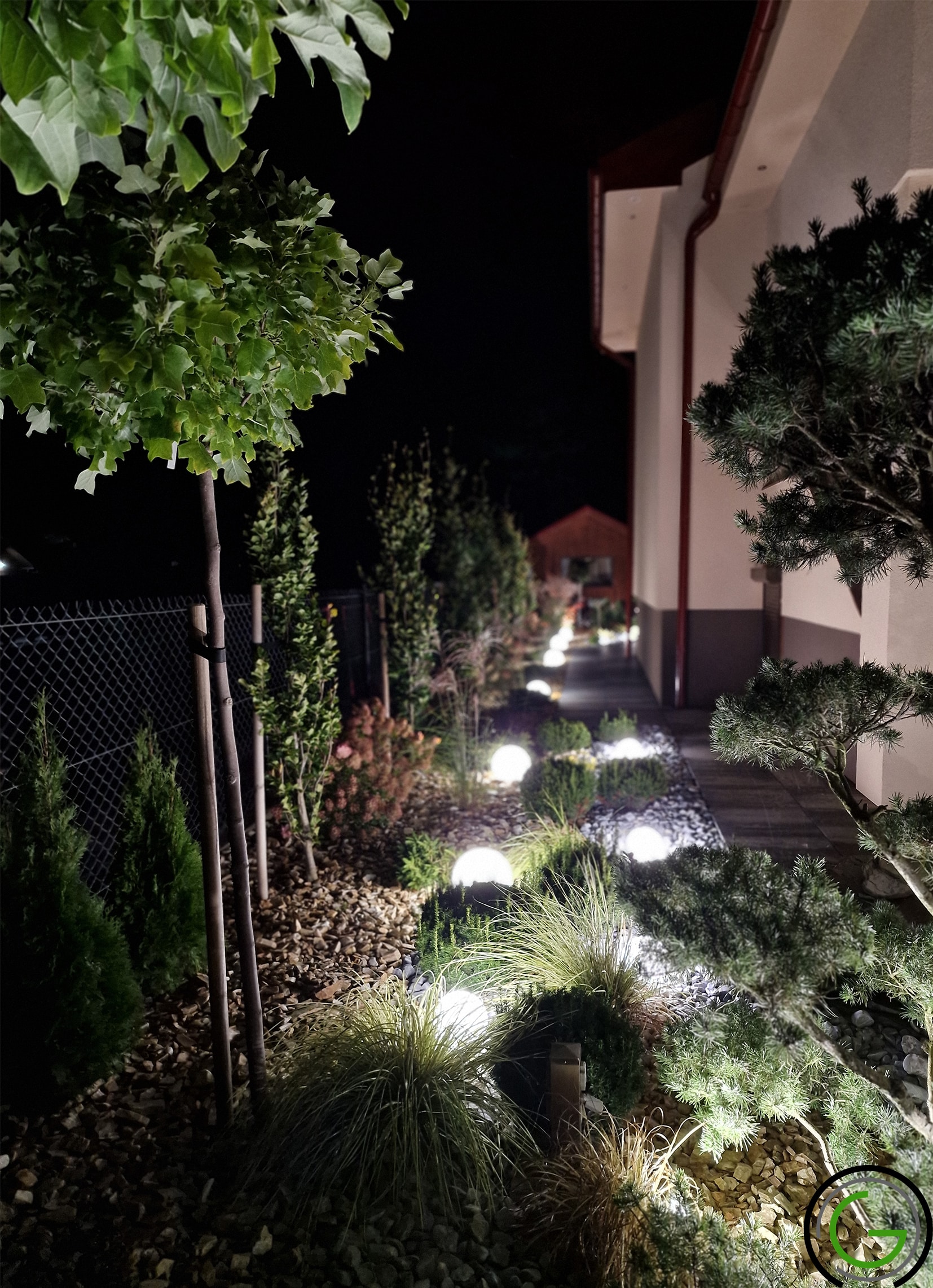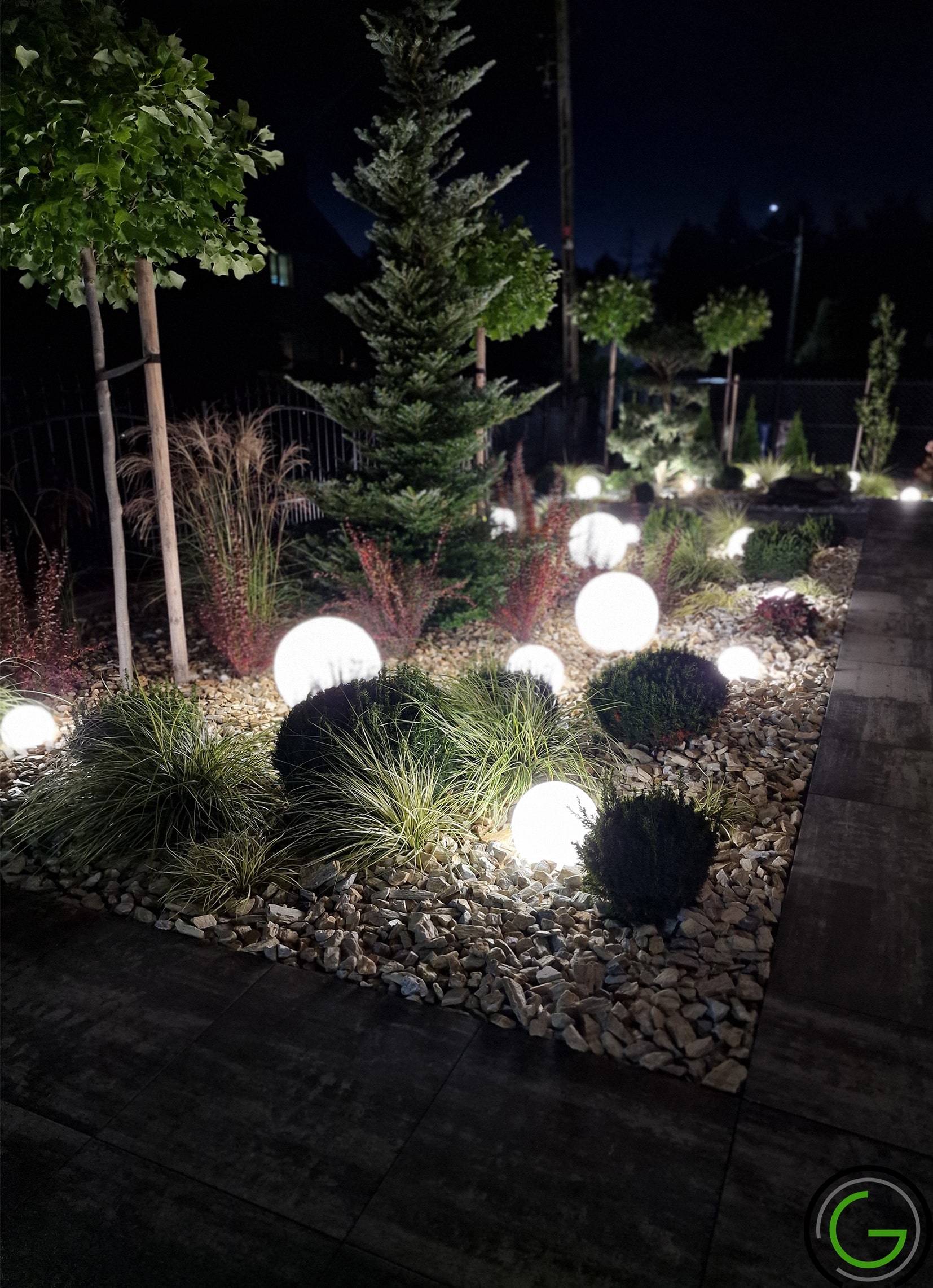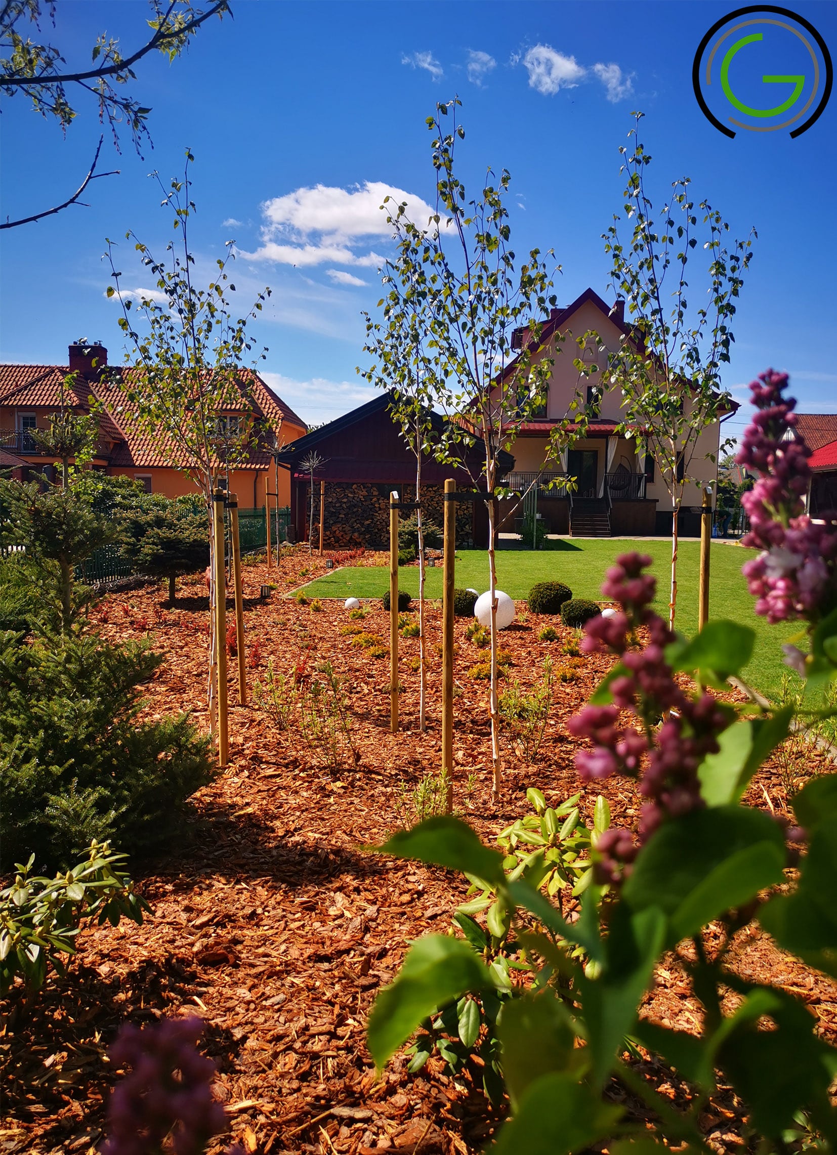 Dzięki przebudowie ogród przeszedł całkowitą metamorfozę, zachowując jedynie pierwotny układ rabat i trawników, które zostały wzbogacone zupełnie nowymi nasadzeniami. Nowoczesny charakter przestrzeni kształtują kompozycje roślinne – delikatny brzozowy zagajnik nadaje lekkości, a klon palmowy wprowadza egzotyczny akcent swoją intensywną barwą oraz okazały bonsai w strefie reprezentacyjnej. Wprowadzono również nowe oświetlenie w postaci eleganckich kul, subtelnie podkreślając najważniejsze elementy ogrodu. Cała przestrzeń po przebudowie zyskała nową, estetykę, oferując idealne miejsce do relaksu w otoczeniu pięknej roślinności i oryginalnych detali.