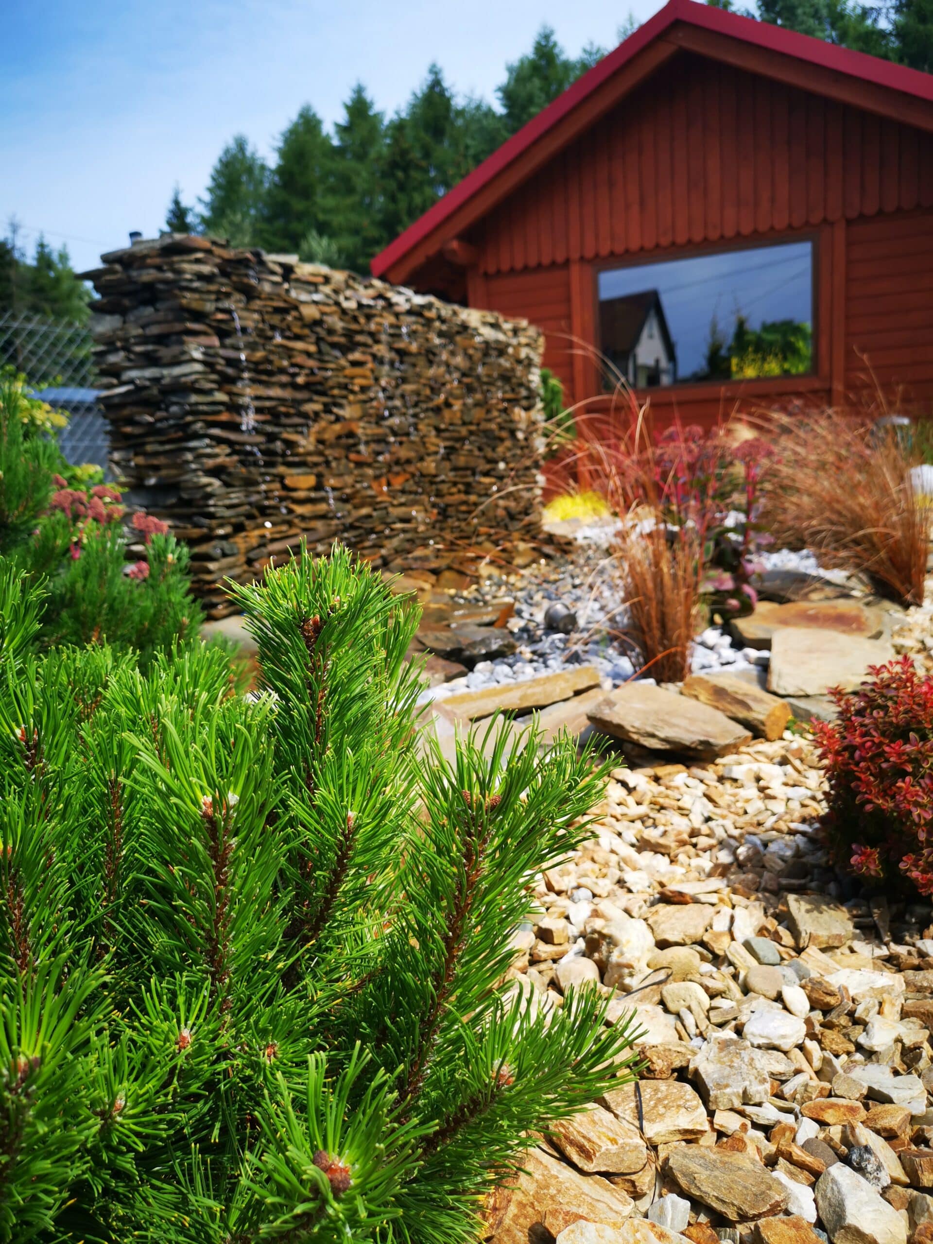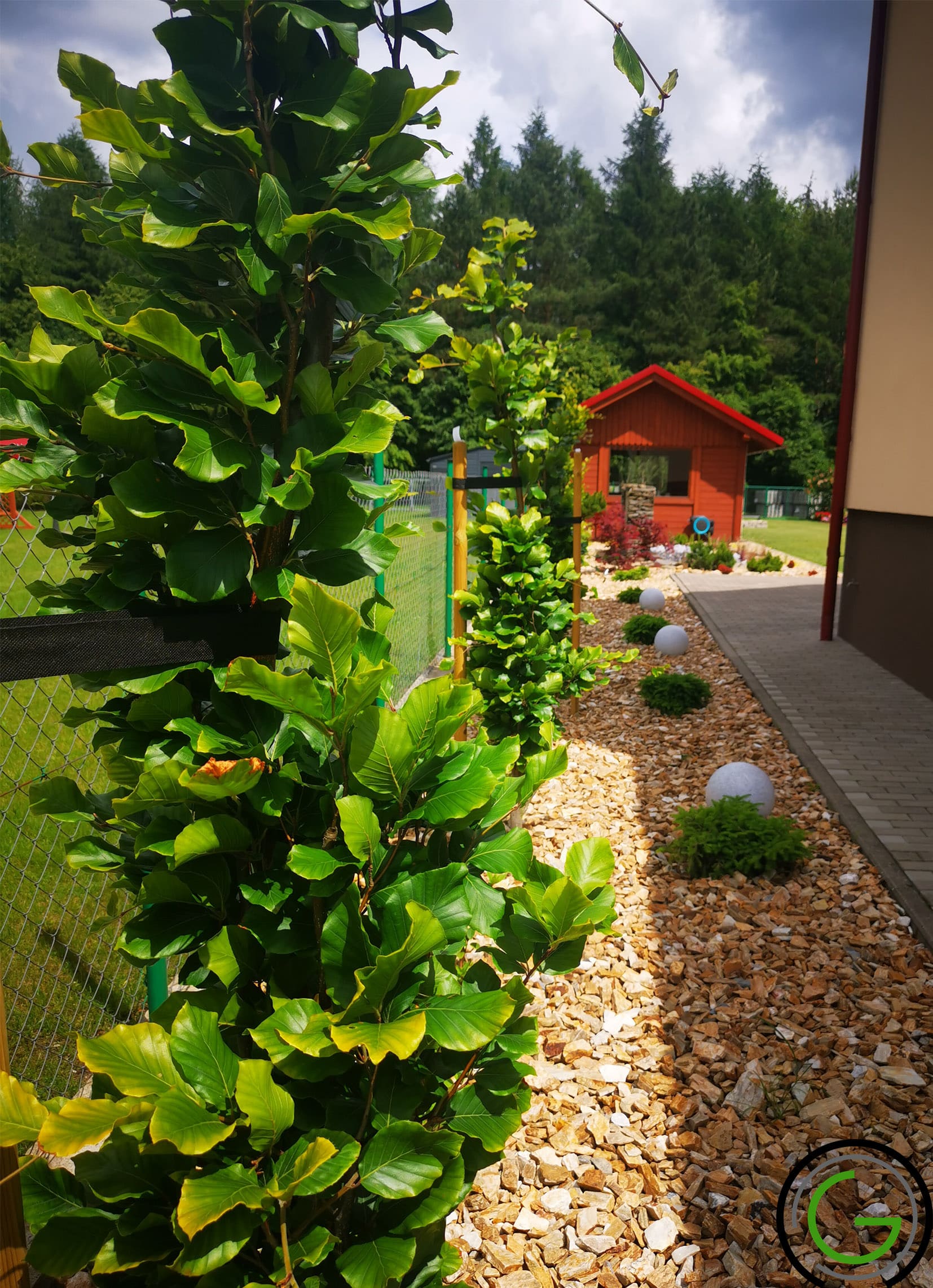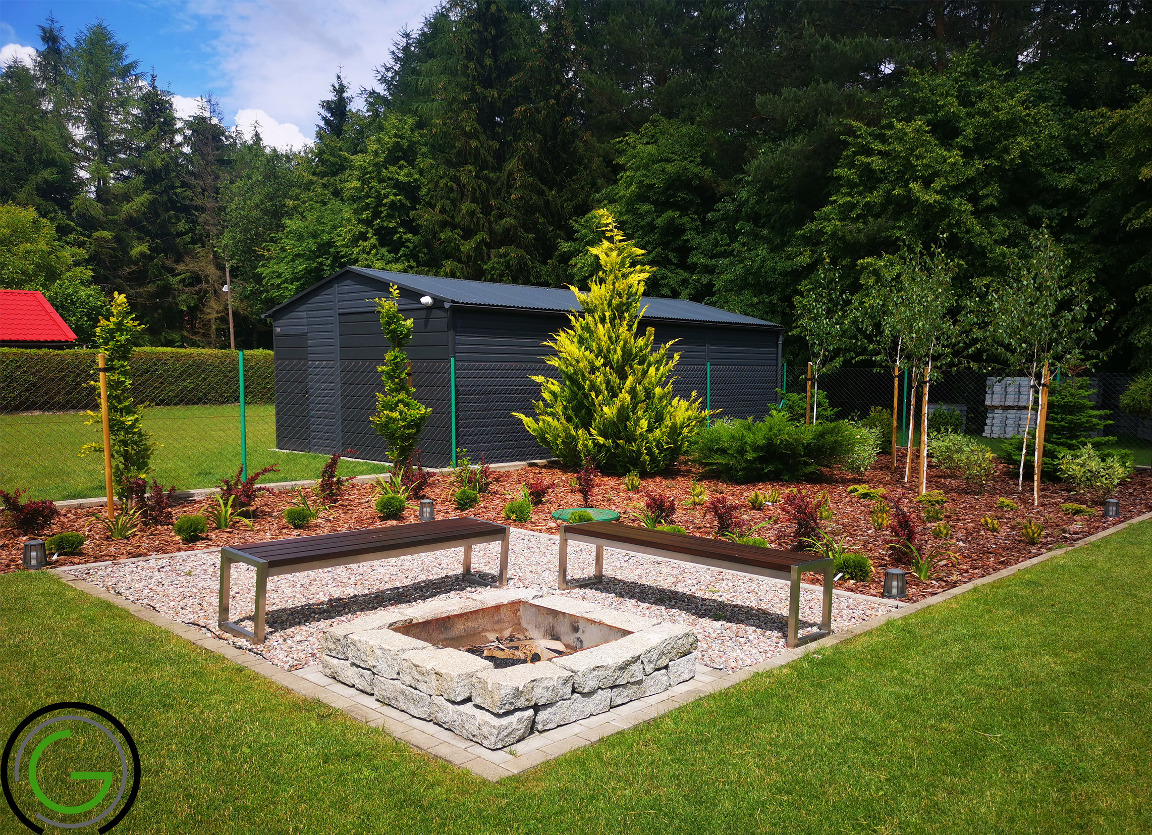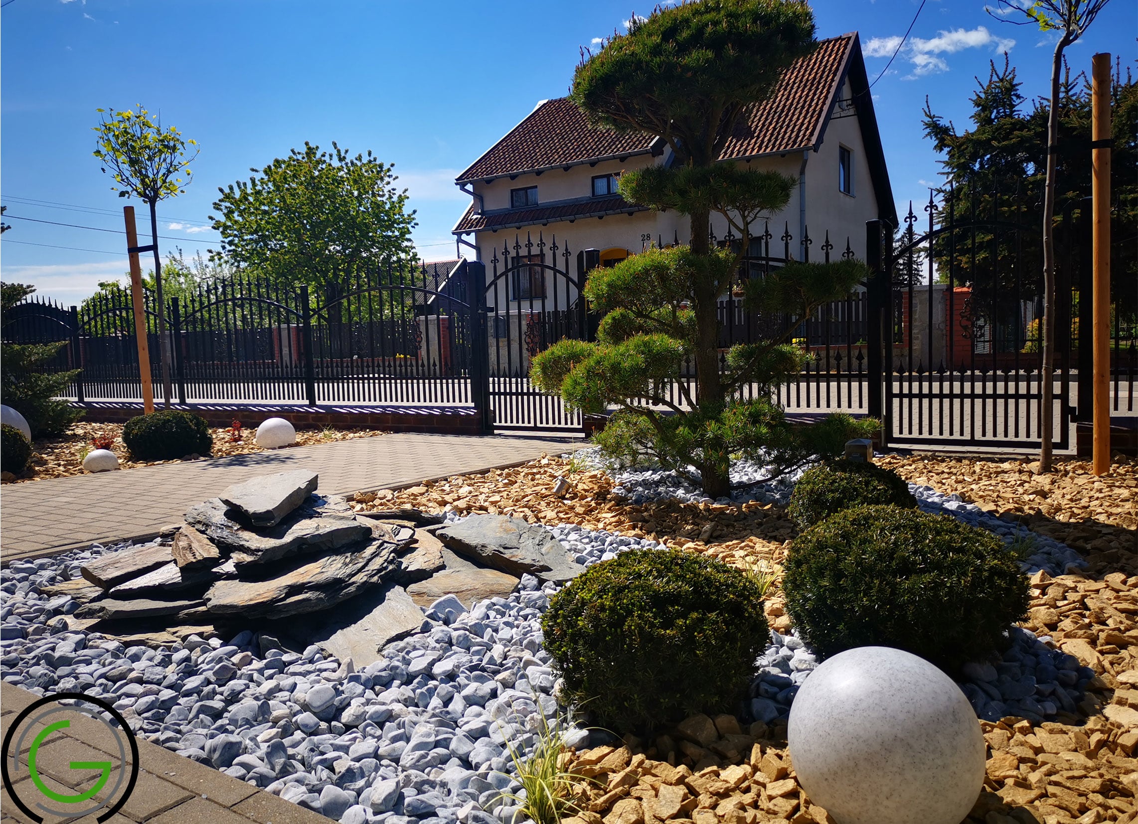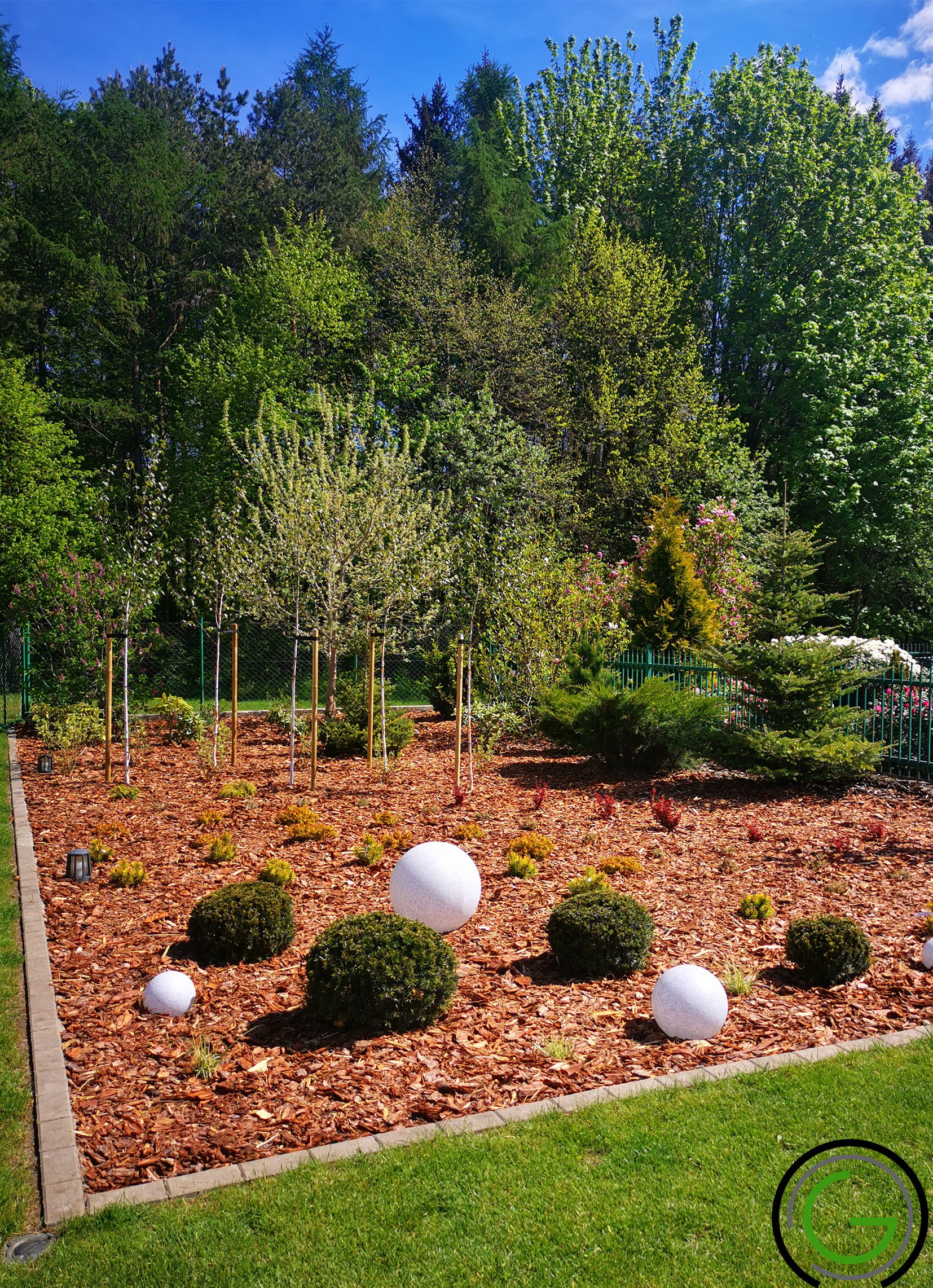 Dzięki przebudowie ogród przeszedł całkowitą metamorfozę, zachowując jedynie pierwotny układ rabat i trawników, które zostały wzbogacone zupełnie nowymi nasadzeniami. Nowoczesny charakter przestrzeni kształtują kompozycje roślinne – delikatny brzozowy zagajnik nadaje lekkości, a klon palmowy wprowadza egzotyczny akcent swoją intensywną barwą oraz okazały bonsai w strefie reprezentacyjnej. Wprowadzono również nowe oświetlenie w postaci eleganckich kul, subtelnie podkreślając najważniejsze elementy ogrodu. Cała przestrzeń po przebudowie zyskała nową, estetykę, oferując idealne miejsce do relaksu w otoczeniu pięknej roślinności i oryginalnych detali.